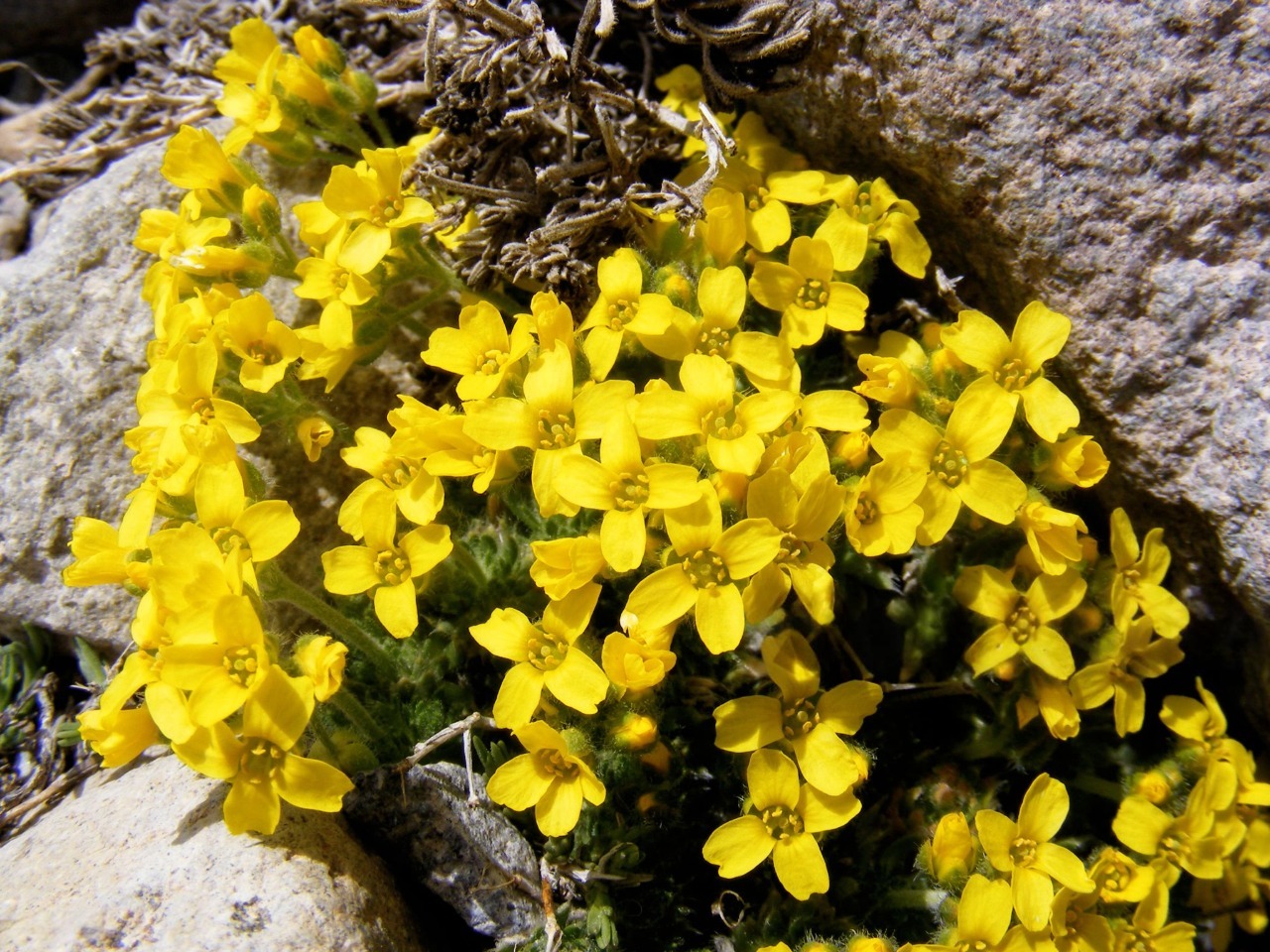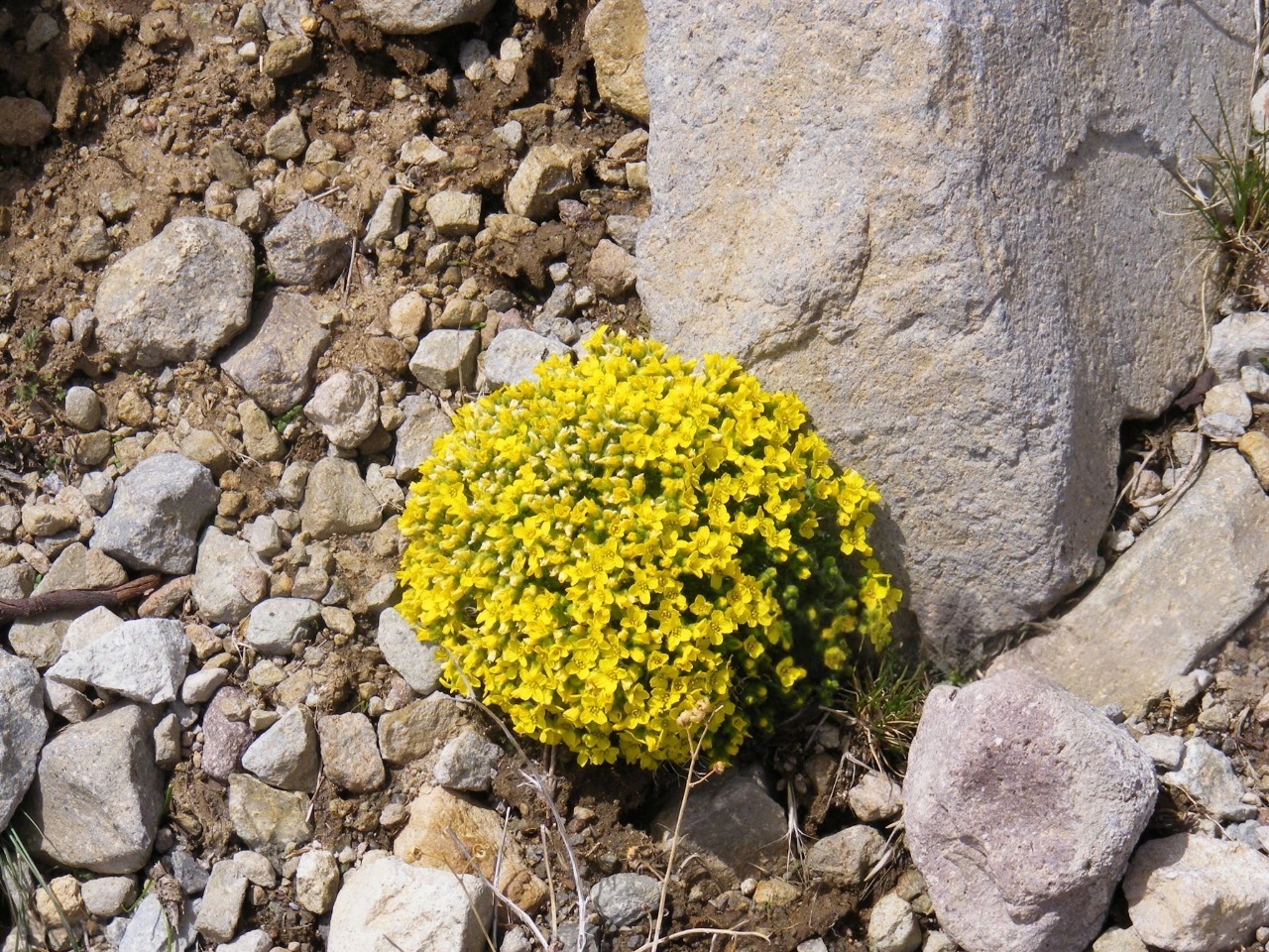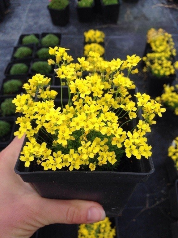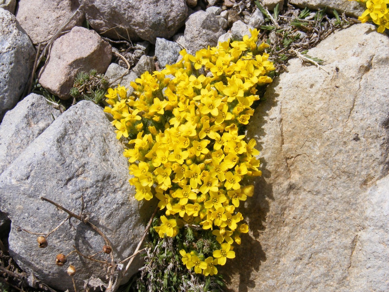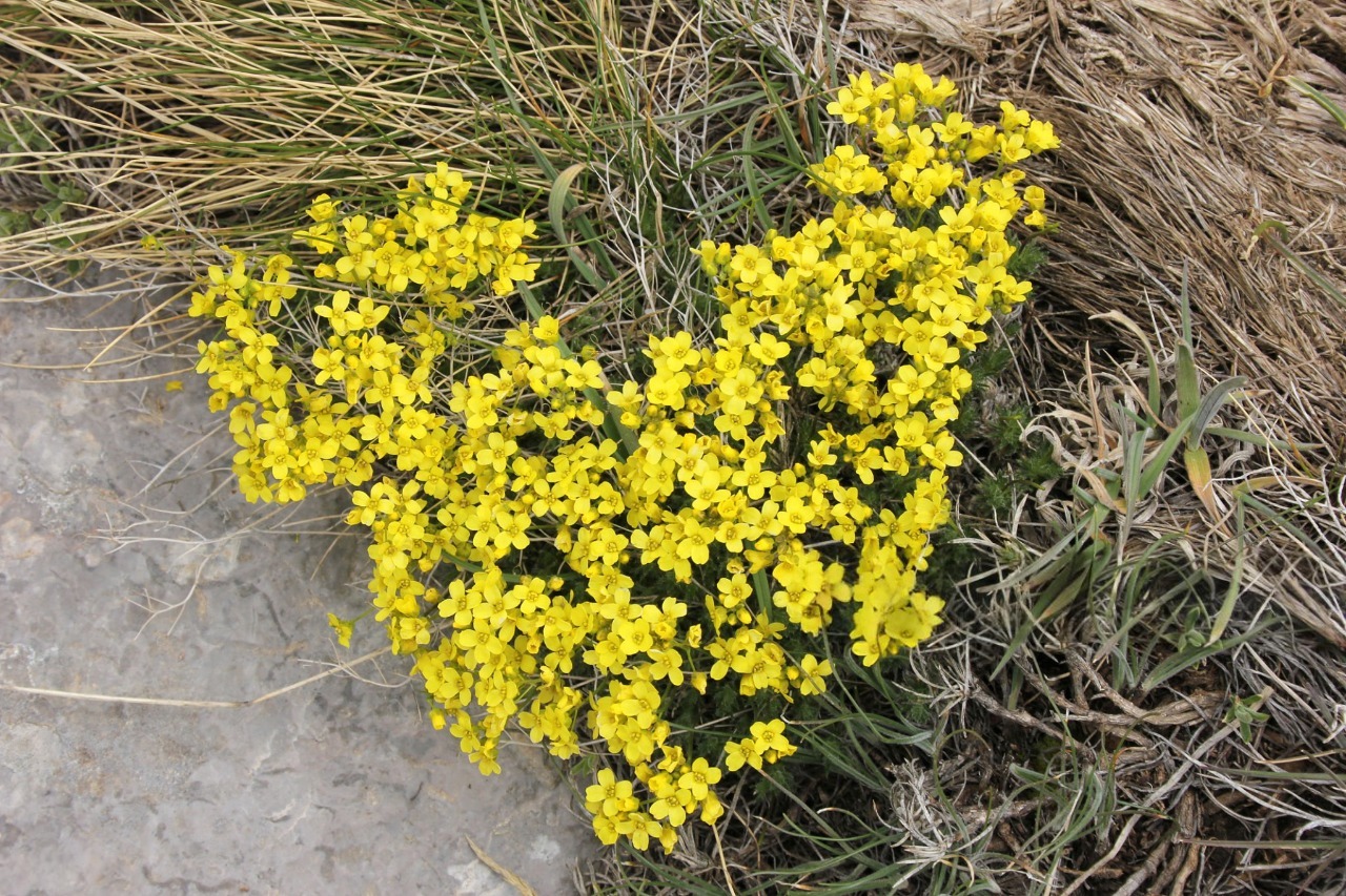 Цвітіння відбувається ранньою весною. На коротких квітконосах з'являються невеликі яскраво-жовті квітки, зібрані в компактні суцвіття, які ефектно вирізняються на тлі щільних зелених подушок. Після цвітіння формуються невеликі стручки з дрібним насінням.