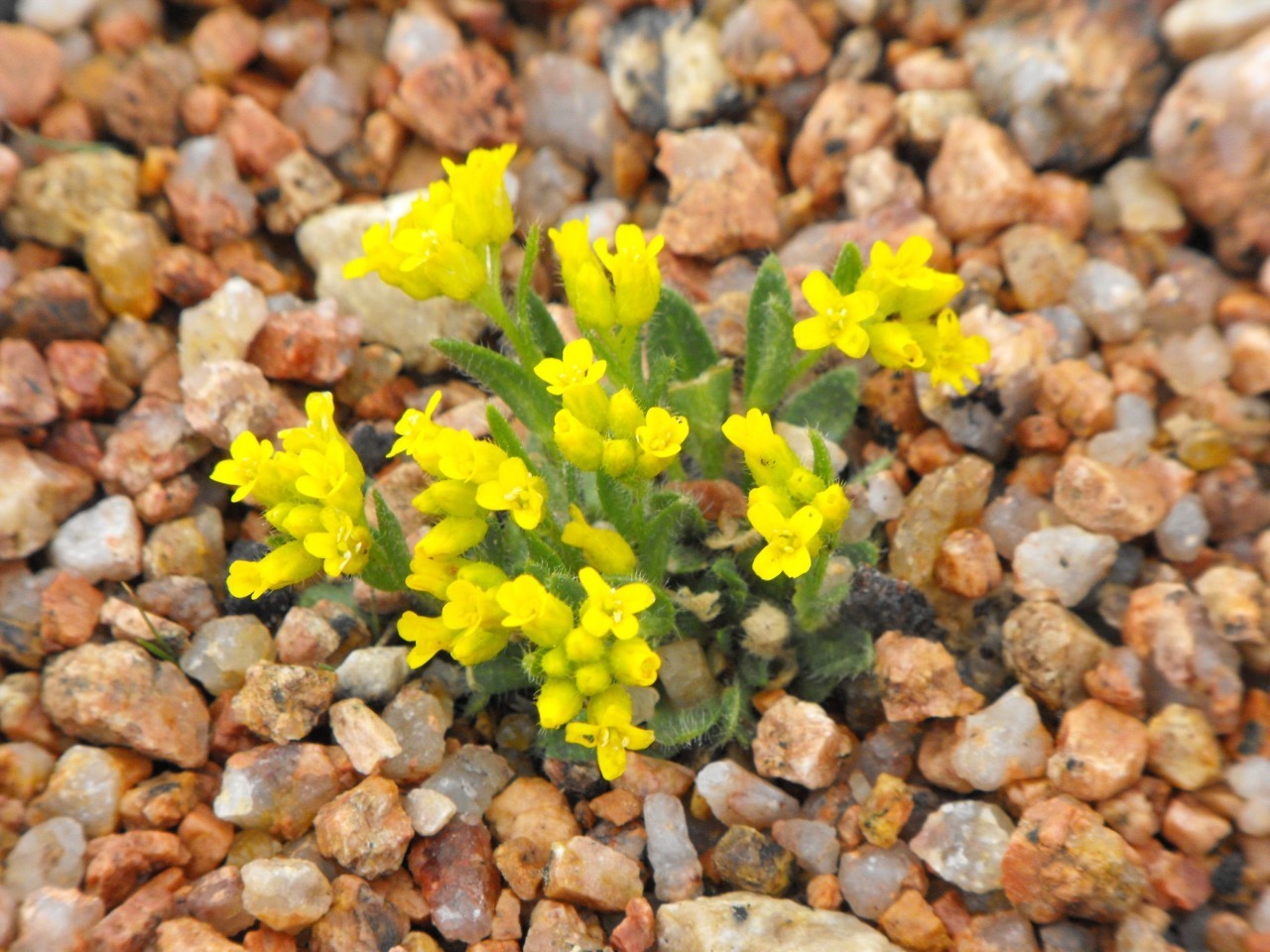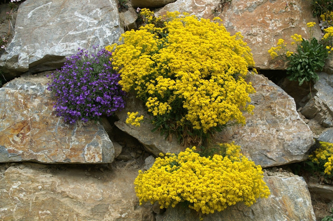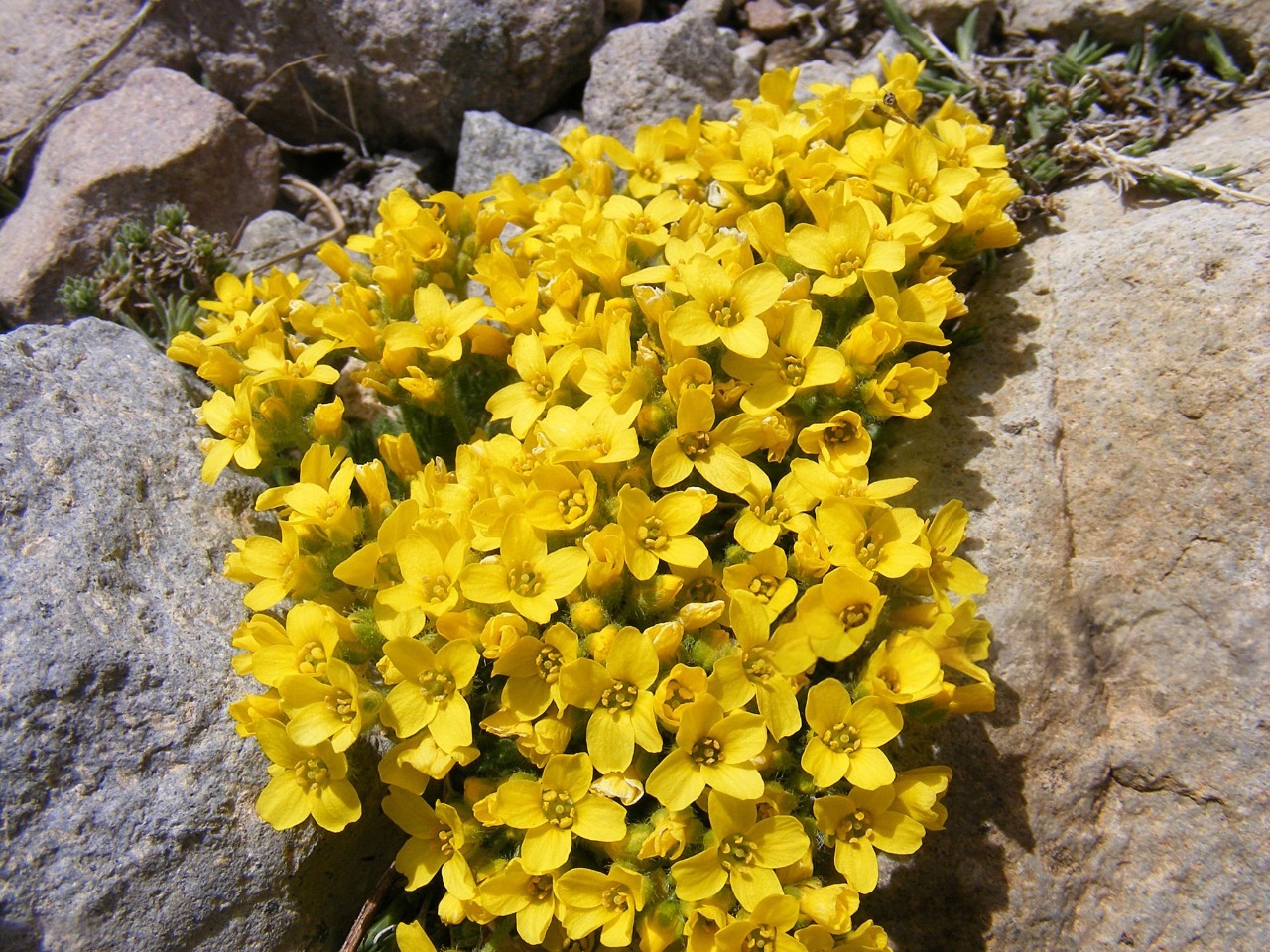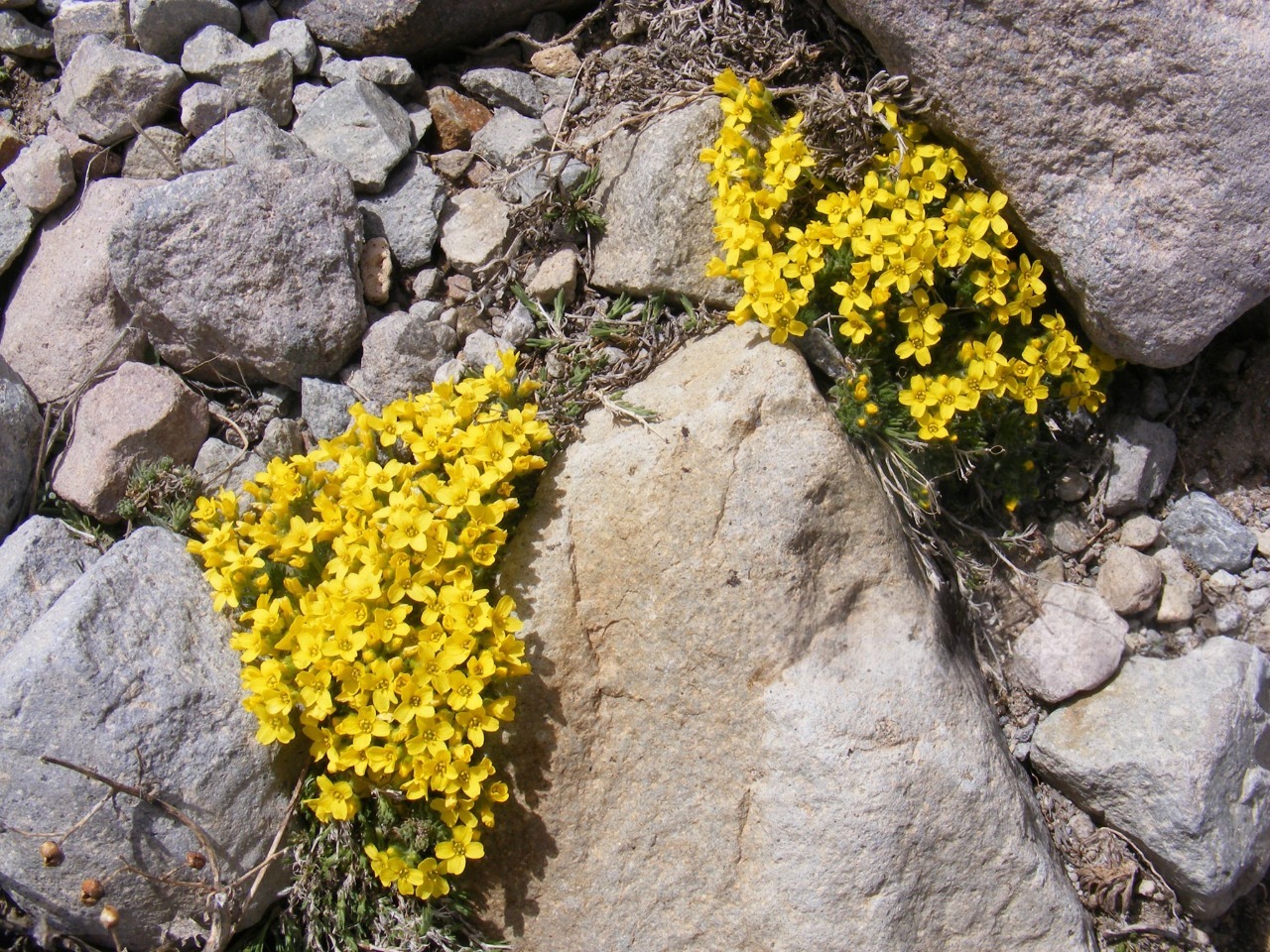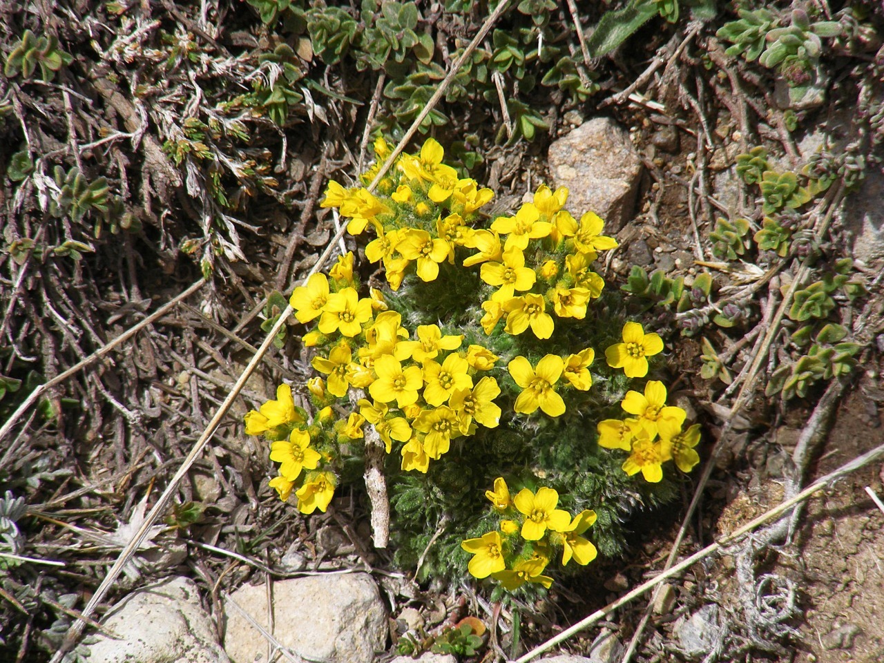 Цвітіння відбувається ранньою весною. На коротких квітконосах з'являються невеликі яскраво-жовті квітки, зібрані в компактні суцвіття, які ефектно вирізняються на тлі щільних зелених подушок. Після цвітіння формуються невеликі стручки з дрібним насінням.
