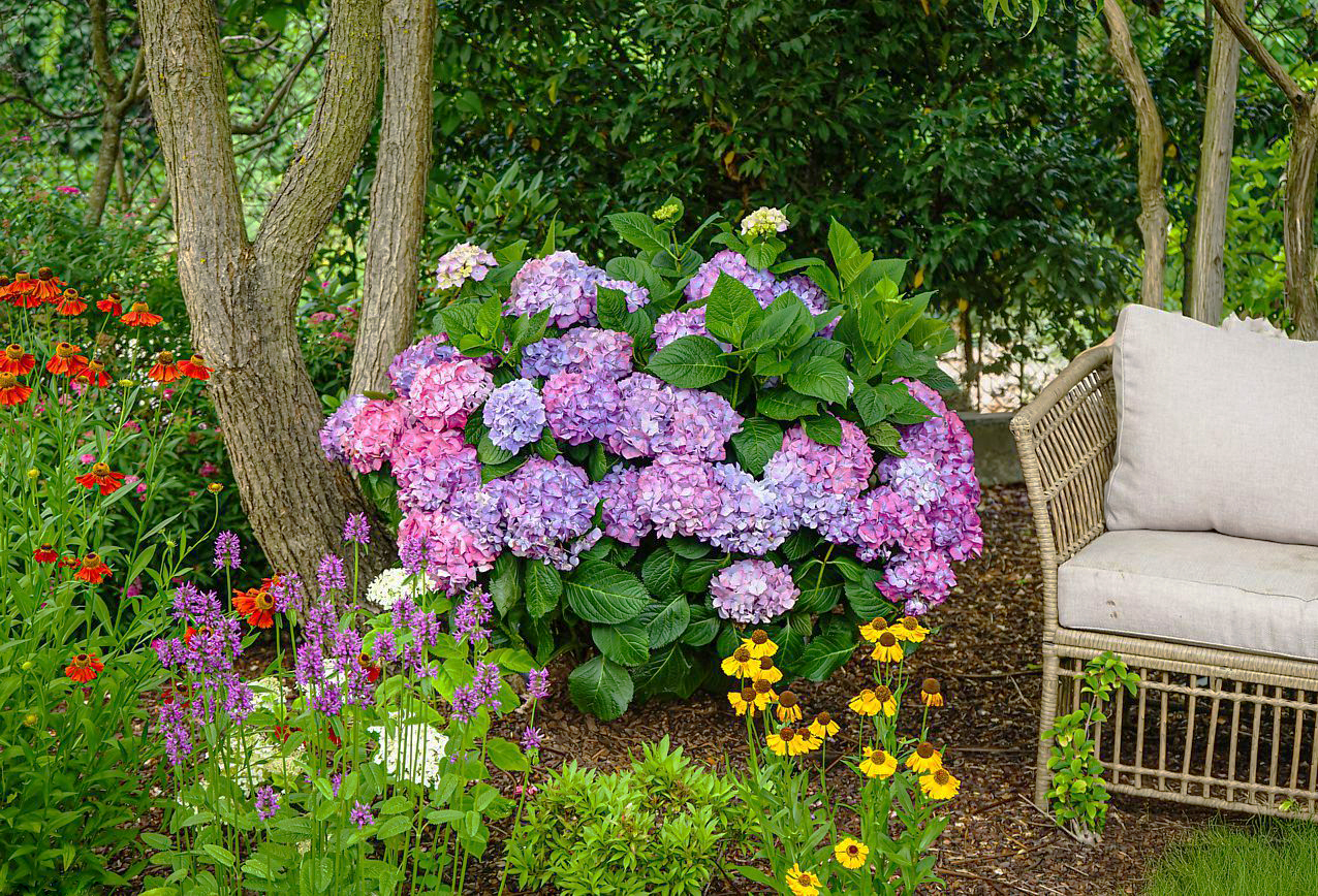 Утворює компактний, щільний, добре розгалужений кущ з густо облистненою кроною округлої форми, виростає 100-120 сантиметрів у висоту і приблизно стільки ж у діаметрі. Пагони міцні, ростуть вертикально, але можуть трохи поникати під вагою великих суцвіть після сильного дощу, що надає кущу природної, розлогої форми. Річний приріст рослини помірний, становить 20-25 сантиметрів. Коренева система неглибока, розгалужена, утворює кореневі нащадки, завдяки чому нерідко сильно розростається в ширину. Листя велике, довгасто-яйцевидної або широко-яйцевидної форми, дрібнозубчасте по краю, товсте, м'ясисте, розташоване супротивно, пофарбоване в темно-зелений колір, іноді з легким червонуватим відтінком, який служить прекрасним тлом для яскравих суцвіть.