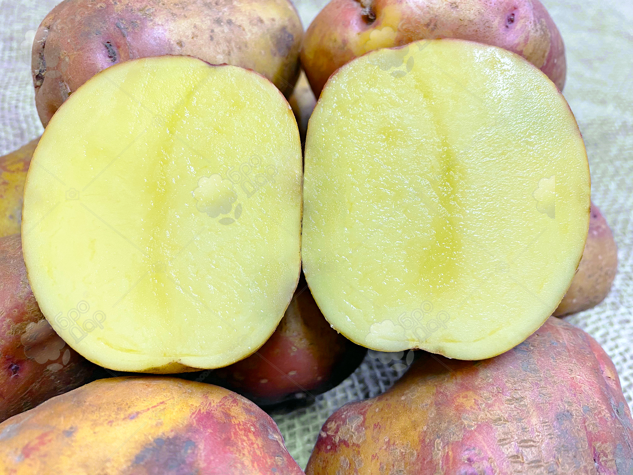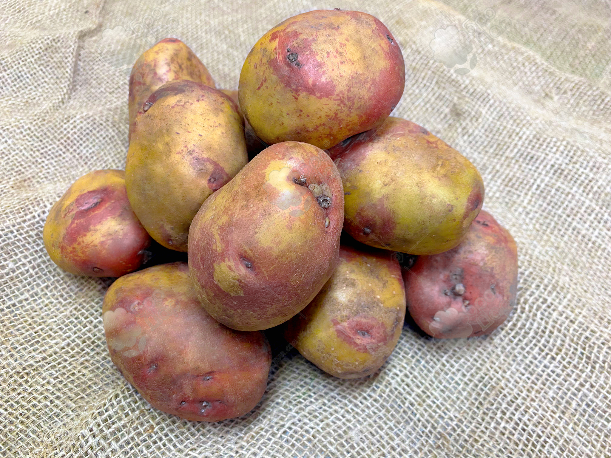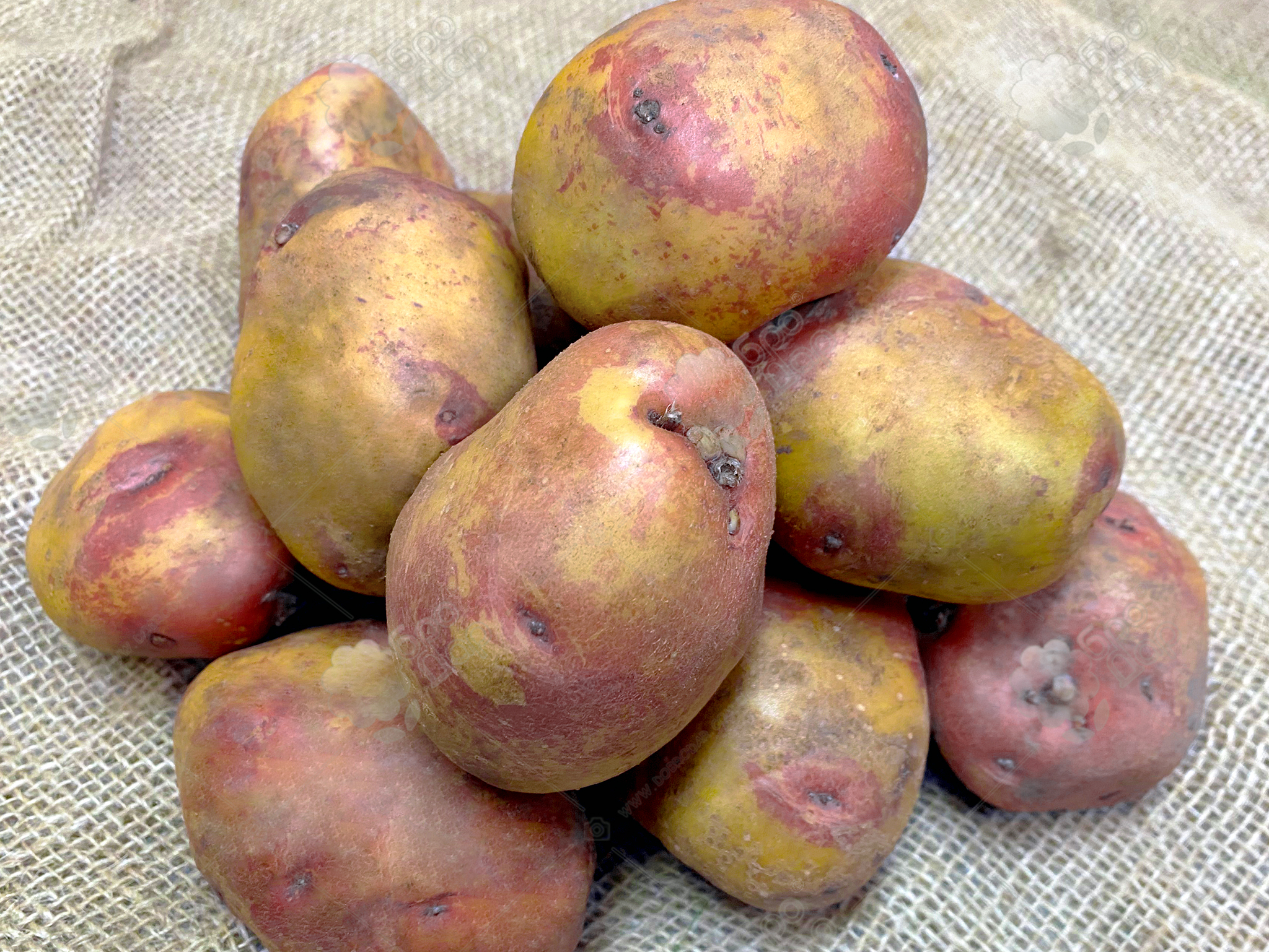 Бульби округло-овальної форми з глибокими вічками, мають два кольори одночасно, рожево-малиновий та жовто-солом'яний.