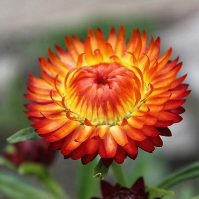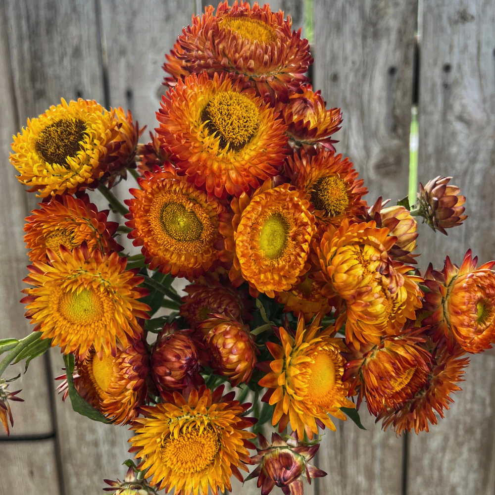 Квіти (Суцвіття): Це кошики діаметром 4–6 см. Те, що ми сприймаємо як «пелюстки», насправді є сухими плівчастими приквітками. У сорту 'Orange' вони мають насичений оранжевий, мідний або теракотовий колір з шовковистим блиском. Центр квітки зазвичай яскраво-жовтий.