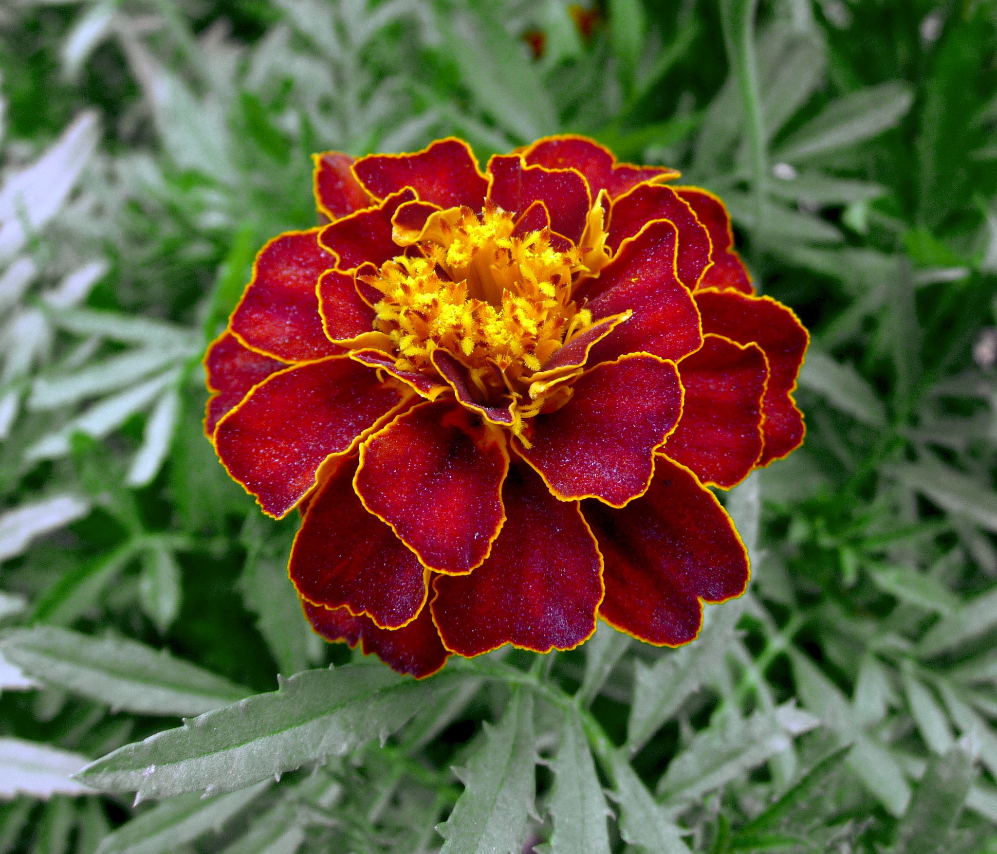 Кущики чорнобривців Червона вишня компактні та пишні, висотою всього 20-30 см, з діаметром крони 25-35 см. Вони сильно гілкуються, утворюючи густі, пухнасті кулі або подушки, особливо якщо садити групами по 5-6 рослин. Стебла міцні, листя дрібне, ароматне, з типовим для чорнобривців "маргаритковим" ароматом, який відлякує шкідників. Рослина формує безліч квітконосів, повністю ховаючи листя під яскравими суцвіттями – ідеально для створення об'ємних бордюрів чи контейнерів. Цвітіння у чорнобривців Червона вишня раннє та рясне – з кінця червня до жовтня, якщо обрізати відцвілі суцвіття. Квіти махрові, помпоновідні, діаметром 3-5 см (до 5-7 см за ідеальних умов), нагадують мініатюрні стиглі вишні. Пелюстки густо набиті, пофарбовані в насичений вишнево-червоний колір із золотисто-жовтою облямівкою по краю та яскравим лимонним центром, що надає квіточкам об'єму та сяйва. Опівдні квіти виблискують на сонці, а в тіні м'яко переливаються, створюючи ефект живого килима. Аромат квіток ніжний, з легкими пряними нотками, що приваблює бджіл та метеликів.