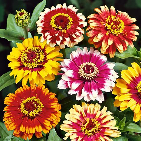 Цинія Карусель — це однорічна рослина. Кущі потужні, розлогі. Стебла прямостоячі, висотою 50-80 см. Суцвіття великі, діаметром 10-15 см, різноманітних двокольорових забарвлень пелюсток. Вирощується посівом насіння у відкритий грунт в травні, або для більш раннього цвітіння, через розсаду в березні-квітні. Цвіте з червня до заморозків. Використовують для декоративного оформлення клумб, квітників, а також для зрізання.