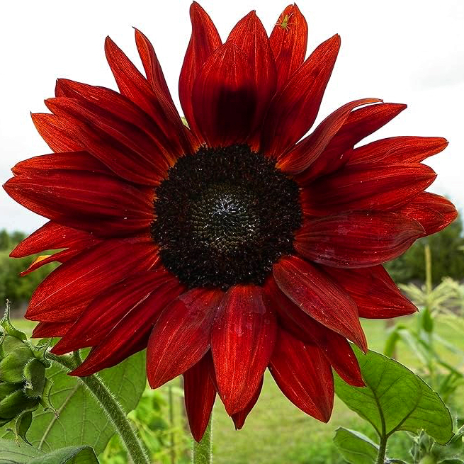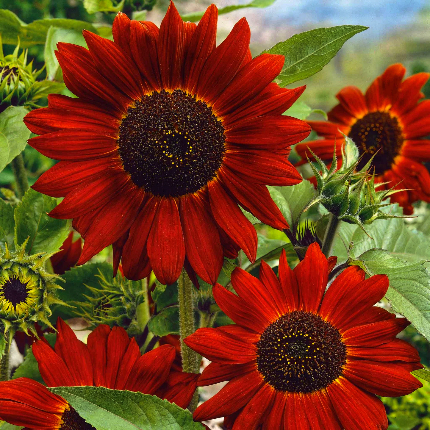 Соняшник Червоне сонце – однорічна рослина. Стебло просте, міцне, до 2,5 м з червоно-коричневими яскравими суцвіттями з більш темною серединкою. Листки на стеблі на довгих черешках, серцеподібні, дуже великі, із загостреною верхівкою. Трубчасті квітки – жовті, червоно-коричневі або навіть з малиновим відтінком. Розмножують посівом насіння безпосередньо в ґрунт навесні. Цвіте з середини літа до заморозків. Іноді дає самосів. Цвітіння рясне і тривале. Віддає перевагу відкритим, доступним для сонячних променів, ділянкам. Вирощувати бажано в захищеному від вітру місці. Любить пухкі, родючі грунти. Рослина не переносить холоду. Може застосовуватися в групових і поодиноких посадках, чудово підходить для створення мальовничих краєвидів.