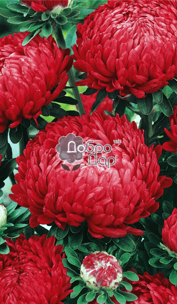Айстра Піоновидна червона – однорічна рослина. Кущ колоноподібний, висотою 50-70см. Квітконоси слабооблистнені, довжиною 35-50см. Суцвіття махрові, діаметром 8-12см, блакитного кольору. На кущі формується до 30 суцвіть на гілках першого та другого порядку. Використовують для зрізу. При висіві насіння, слід пам’ятати, що насіння яке проростає не витримує пересихання ґрунту, а також надлишок вологи та різкі коливання температури.