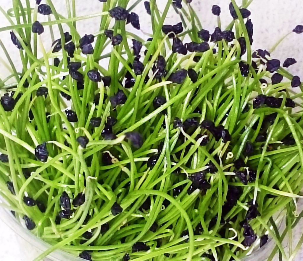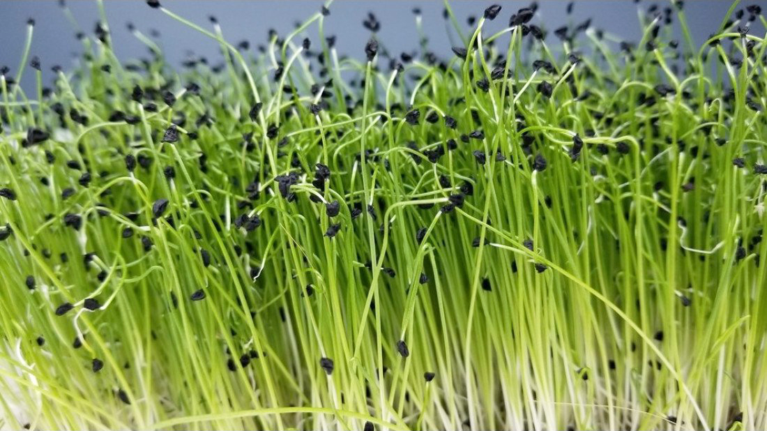 Мікрозелень – це молоді рослини у фазі першої пари справжніх листочків (зрізають стебло з першим листям над поверхнею ґрунту чи субстрату через 7-14 днів). Вирощують у ґрунті, на килимках або гідропоніці. Має насичений, виражений смак, що нагадує дорослу рослину (наприклад, шпинат, редис, соняшник, броколі).
