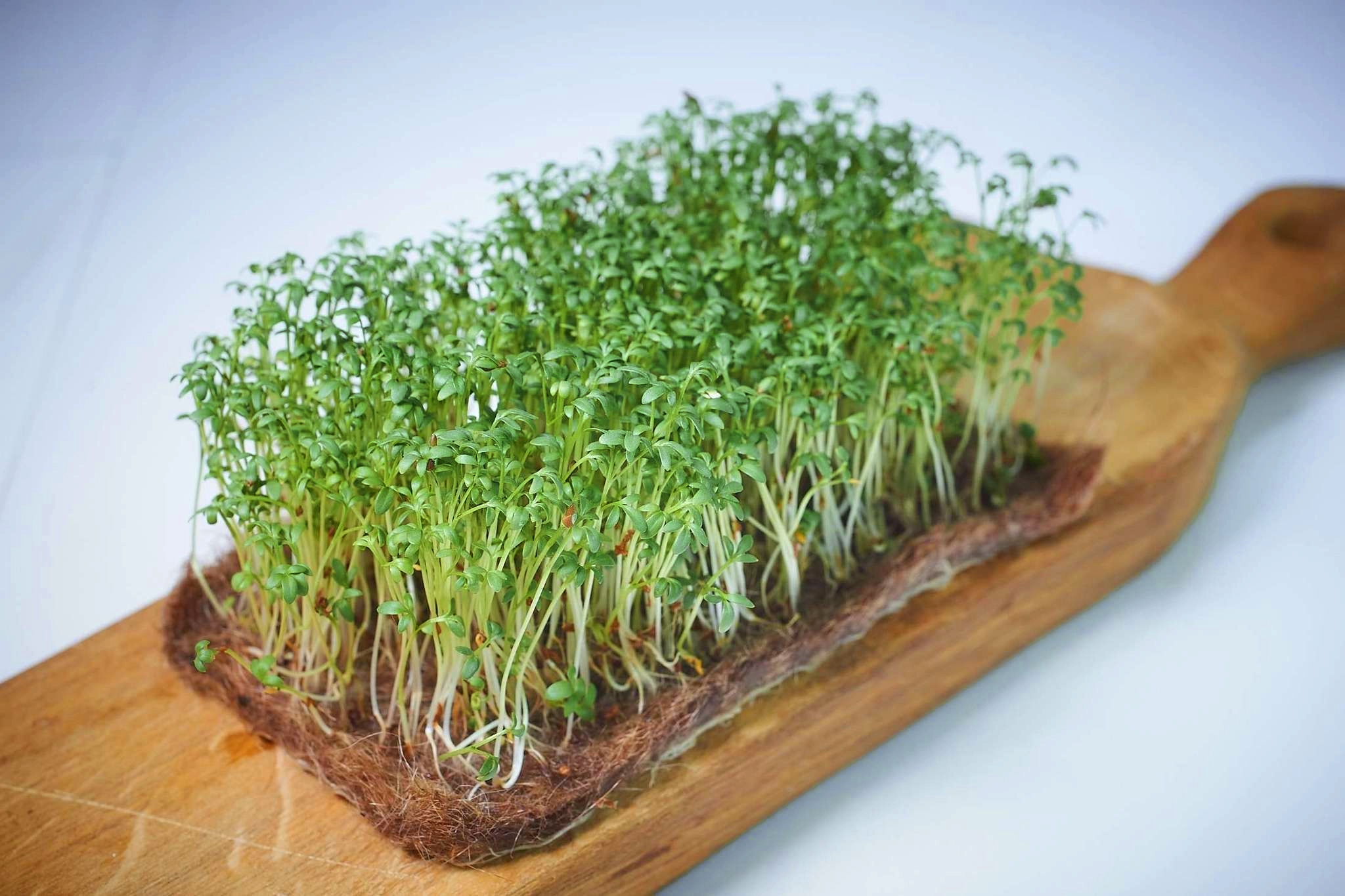 Через 7-14 днів (коли з’явиться перша пара справжніх листочків, висота 5-9 см) зріжте мікрозелень гострими ножицями або ножем трохи вище поверхні субстрату. Не перерощуйте — смак стає менш ніжним.