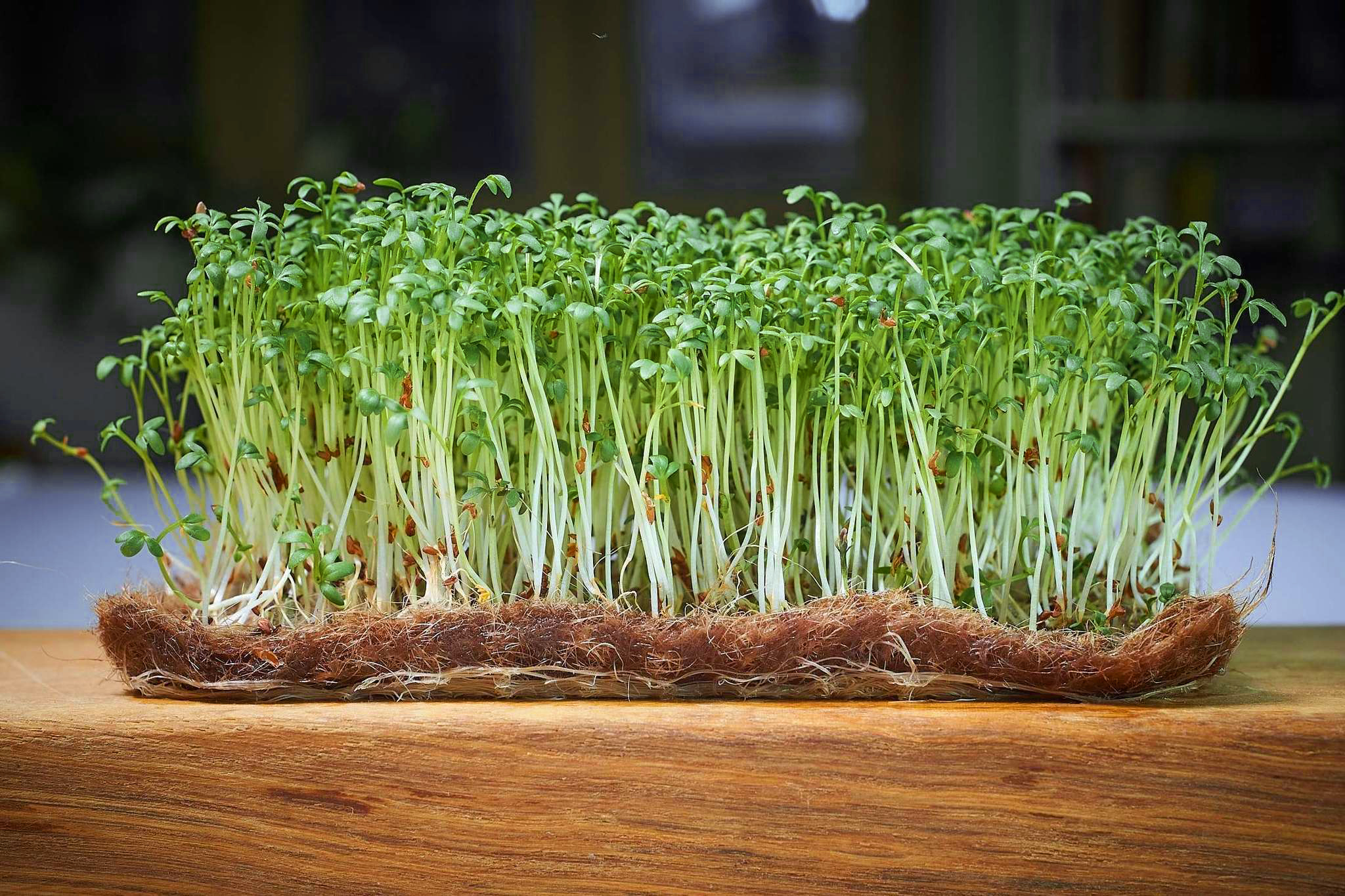 Візьміть неглибокий лоток з дренажними отворами. Заповніть якісним пухким ґрунтом або зволоженим кокосовим/джутовим килимком (шар 3-5 см). Густо розподіліть насіння по поверхні (майже суцільно, 2-3 г на 10×10 см), злегка притисніть і присипте тонким шаром ґрунту (0,5-1 см) або просто зволожте. - Проростання