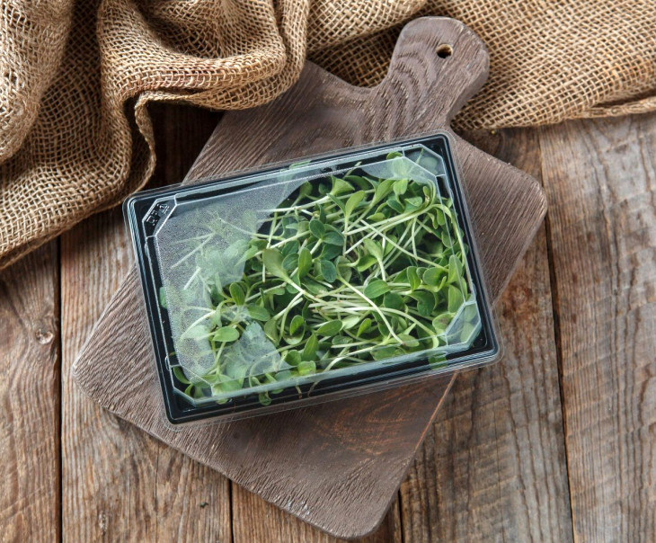 Мікрозелень – це молоді рослини у фазі першої пари справжніх листочків (зрізають стебло з першим листям над поверхнею ґрунту чи субстрату через 7-14 днів). Вирощують у ґрунті, на килимках або гідропоніці. Має насичений, виражений смак, що нагадує дорослу рослину (наприклад, шпинат, редис, соняшник, броколі).