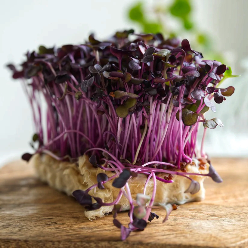 Колір Мікрозелені: Стебла мають насичений фіолетовий (пурпуровий) колір, а сімядольні листки — зелені, що створює ефектний контраст.