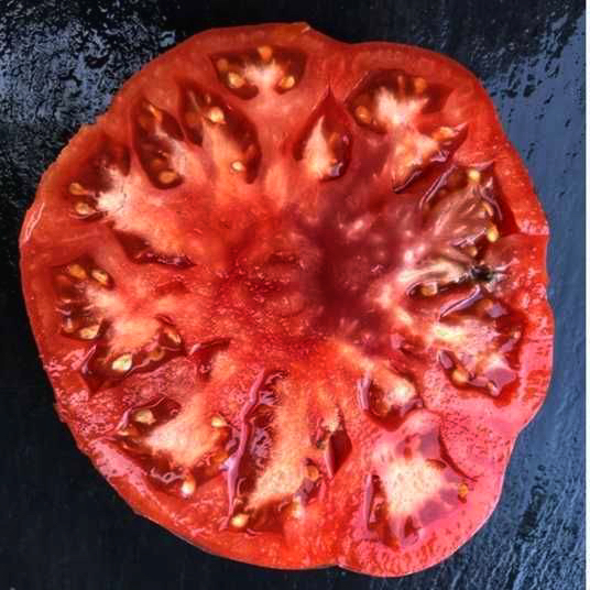 М’якоть: На розрізі — справжній "кавун". М’якоть цукриста, щільна, темно-червоного кольору. Насіннєві камери дуже маленькі, а насіння небагато, що робить цей томат ідеальним для тих, хто не любить зайву рідину.