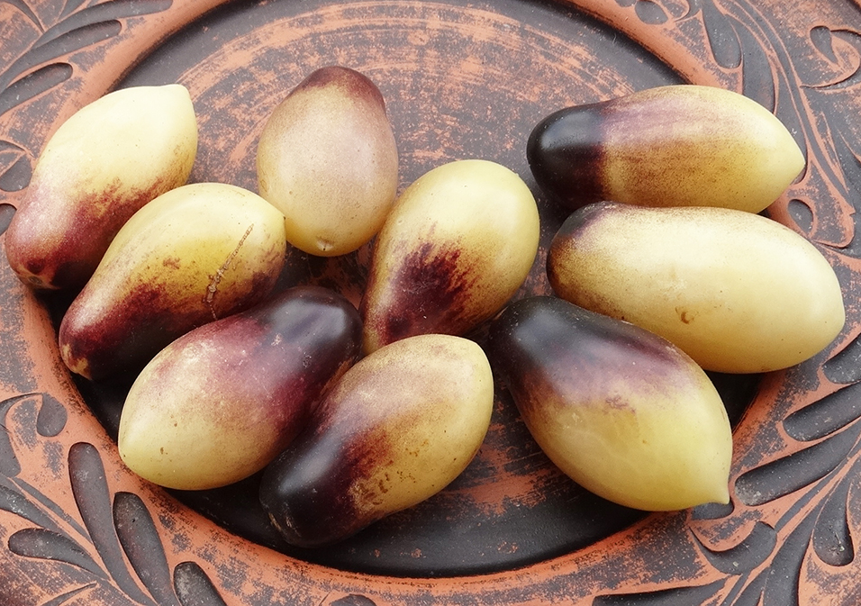 Головна «фішка» сорту — його неймовірний колір. Плоди мають ніжний кремово-жовтий або майже білий колір, а частина, на яку потрапляє пряме сонячне світло, забарвлюється в насичений фіолетовий або вугільно-чорний антоціан. Чим більше сонця — тим темнішими будуть «плічка» томата.