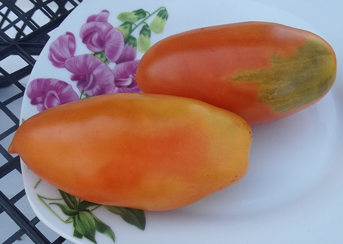 Плоди, подовжені з «носиком», яскраво-оранжевого кольору вагою близько 90 – 120 г. Смакові якості свіжих плодів добрі. М'ясисті, смачні, з підвищеним вмістом бета-каротину. Не викликають алергії.