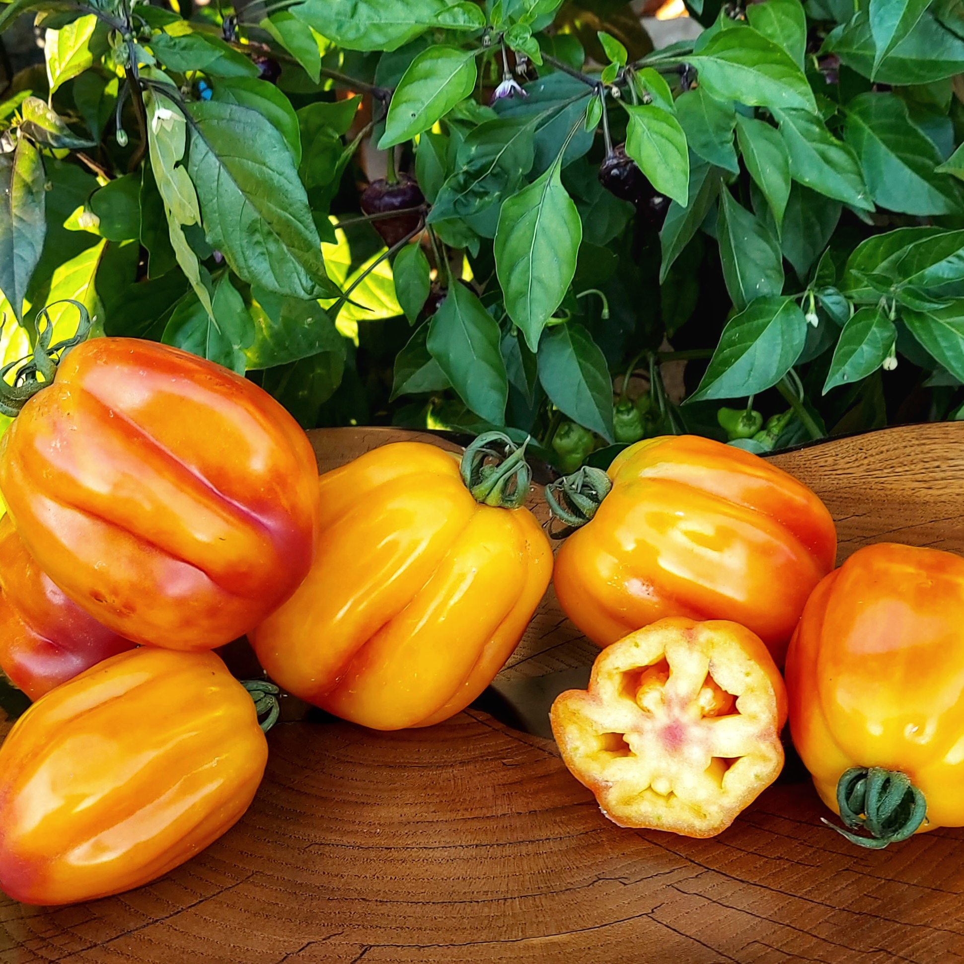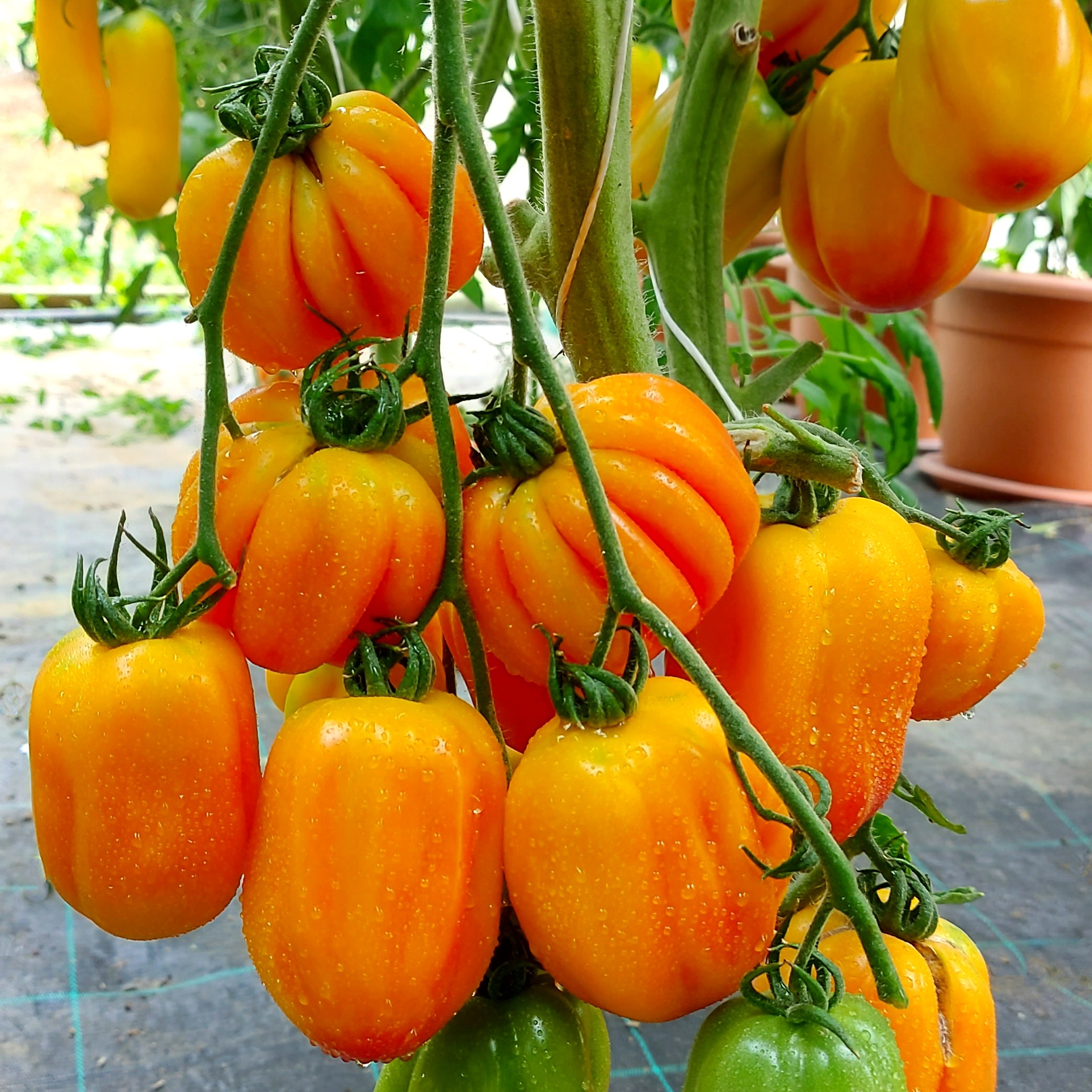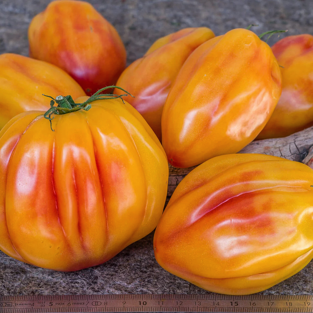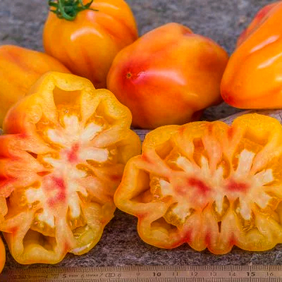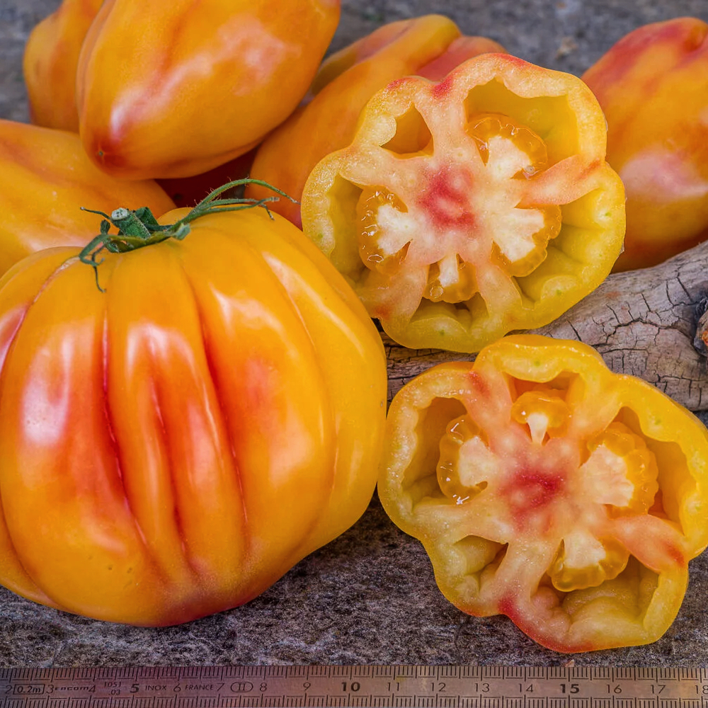 Плоди: Витягнуті вертикально з глибокими, чітко вираженими ребрами по всій довжині. У розрізі такий томат має вигляд зірки або квітки, що робить його незамінним для декорування страв.