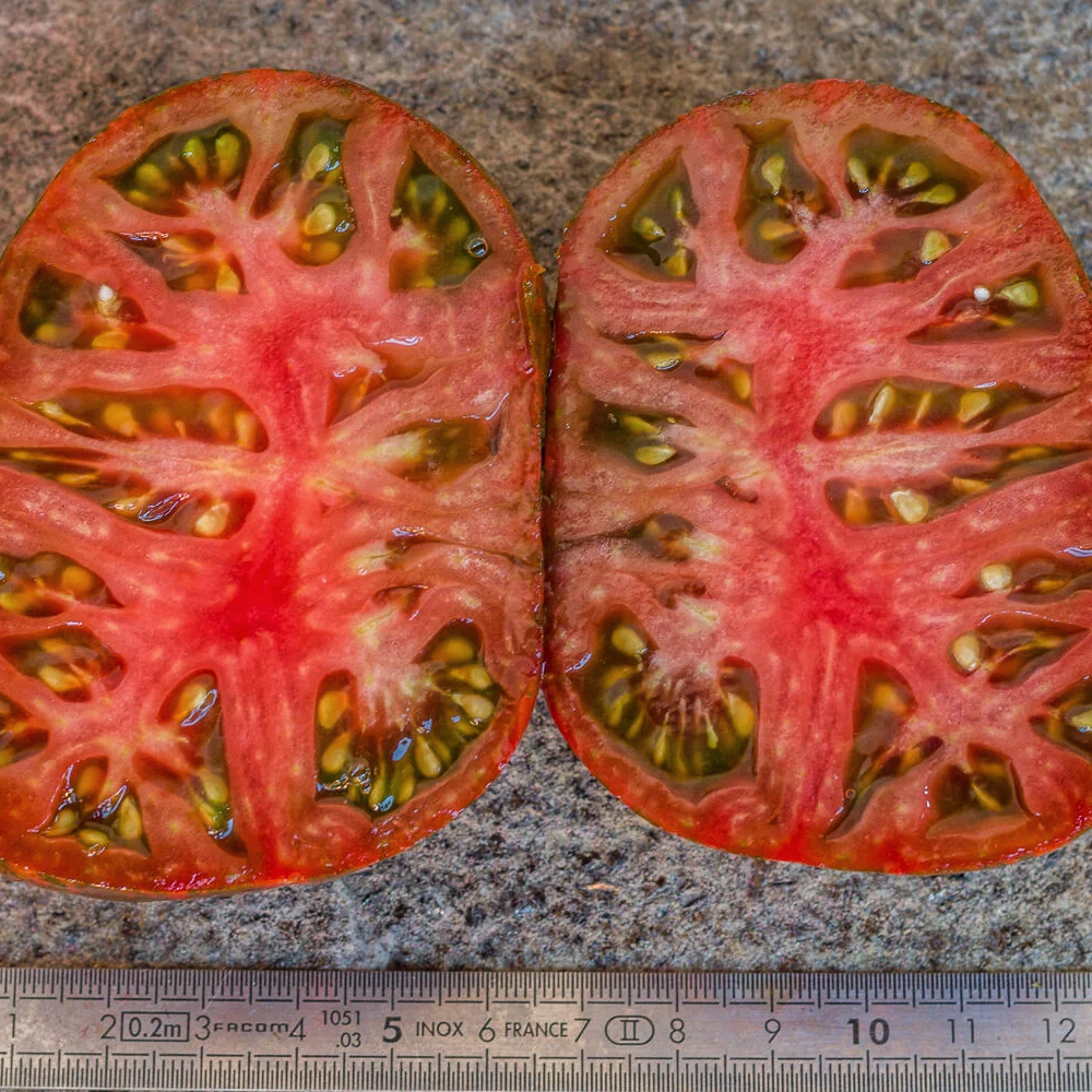У розрізі: М’якоть насиченого вишневого або темно-червоного кольору, густа, м’ясиста (тип «біфштекс»), майже без насіння.