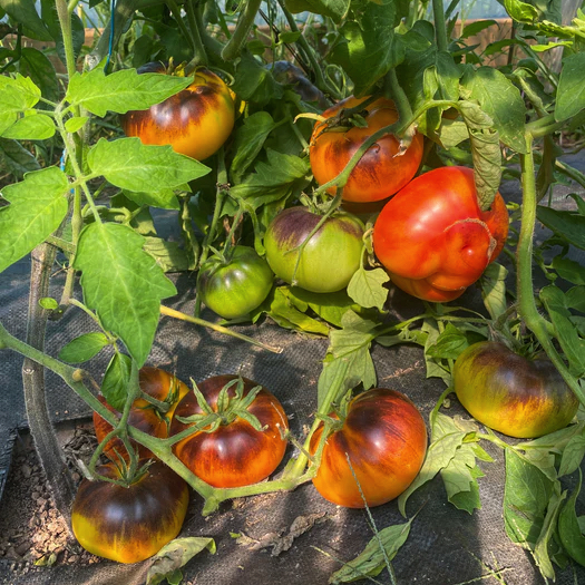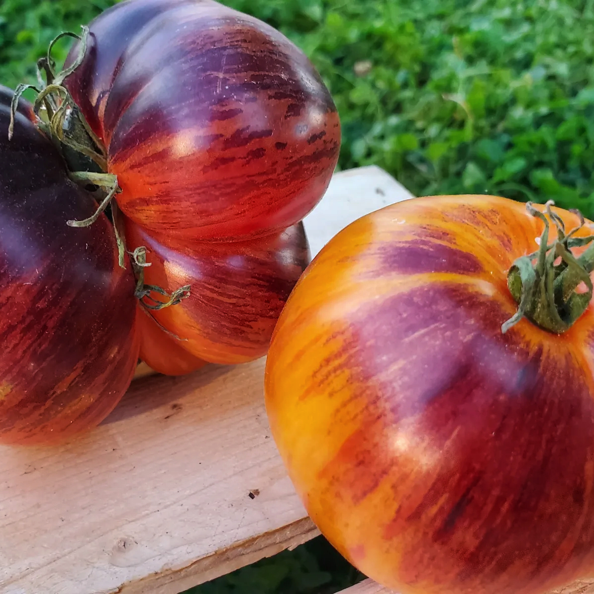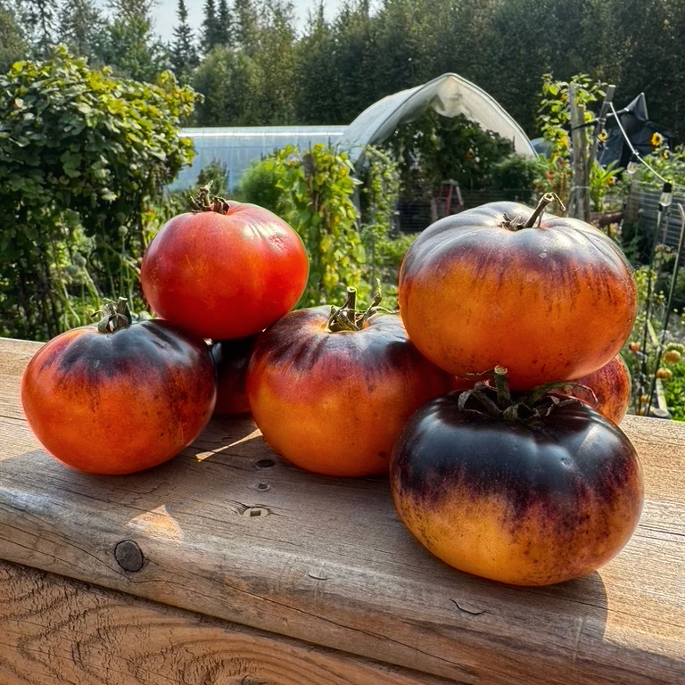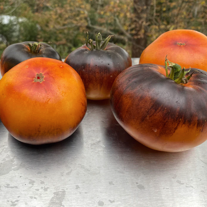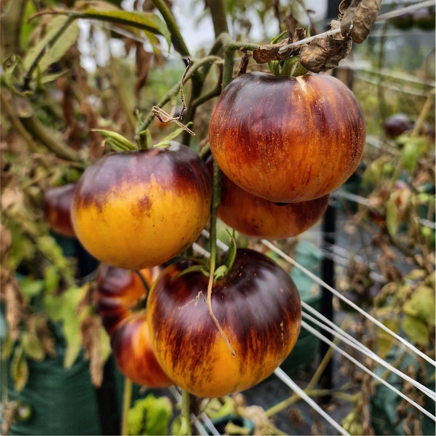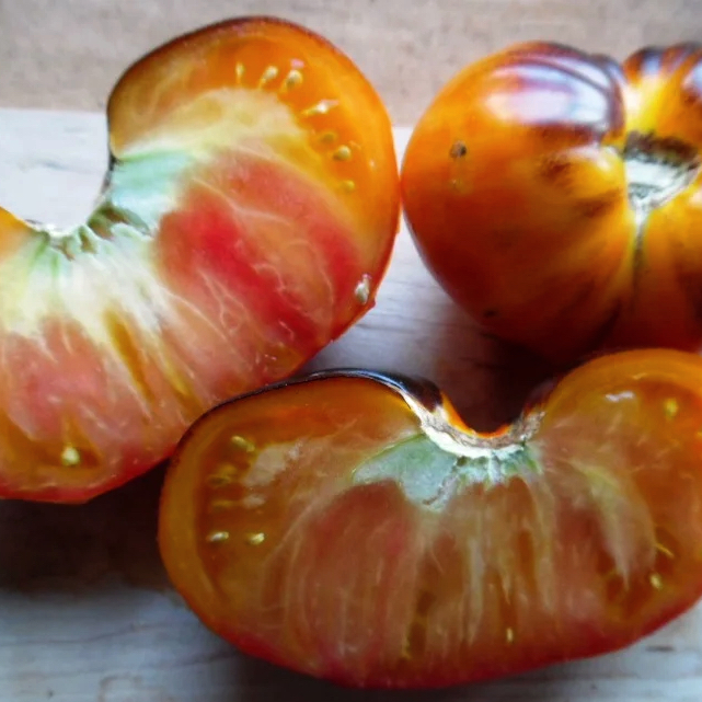 Зовні: Основний фон — золотисто-оранжевий, прикрашений яскравими червоними та рожевими поздовжніми смугами. Плічка томата (верхня частина) вкриті густим темно-фіолетовим (майже чорним) антоціаном, який стає інтенсивнішим на сонці.