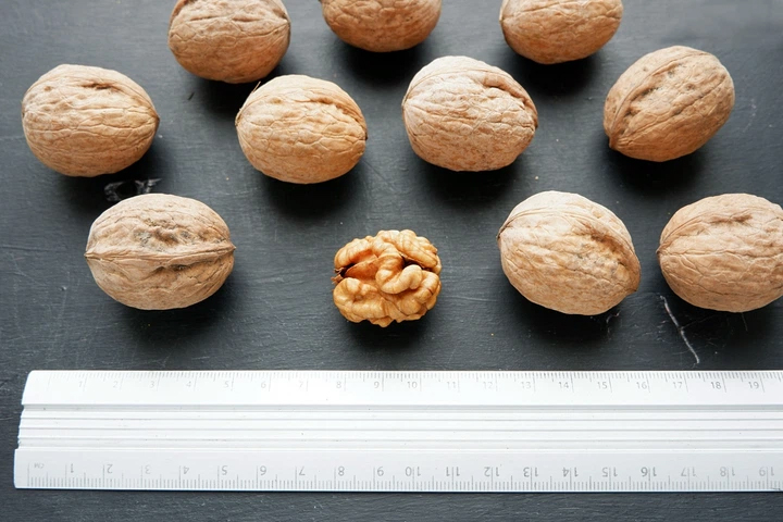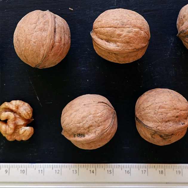 Плоди великі, вирівняні, округлої чи овально-округлої форми. Середня маса горіха становить близько 10-14 грамів. Шкаралупа середньої товщини, досить міцна, але при цьому легко розколюється, забезпечуючи добрий вихід ядра. Ядро світле, маслянисте, із приємним солодкуватим смаком, без вираженої гіркоти. Вихід ядра відмічається високий – до 50-55%, що робить сорт привабливим для переробки та реалізації. Сорт відноситься до скороплідних – набуває плодоношення на 3-4 рік після посадки. Плодоношення регулярне та рясне. Горіхи формуються як поодиноко, так і в гронах по 2-4 плоди, що сприяє високій врожайності. Дозрівання припадає на вересень – початок жовтня. Плоди легко відокремлюються від навколоплодня, добре підсихають і підходять для тривалого зберігання. Горіхи вирізняються гарною транспортабельністю та зберігають товарні якості протягом тривалого часу.