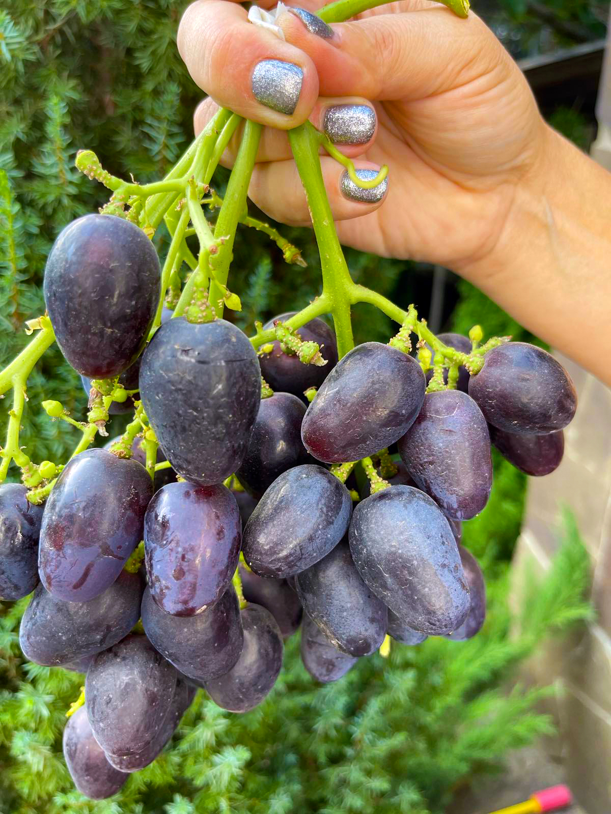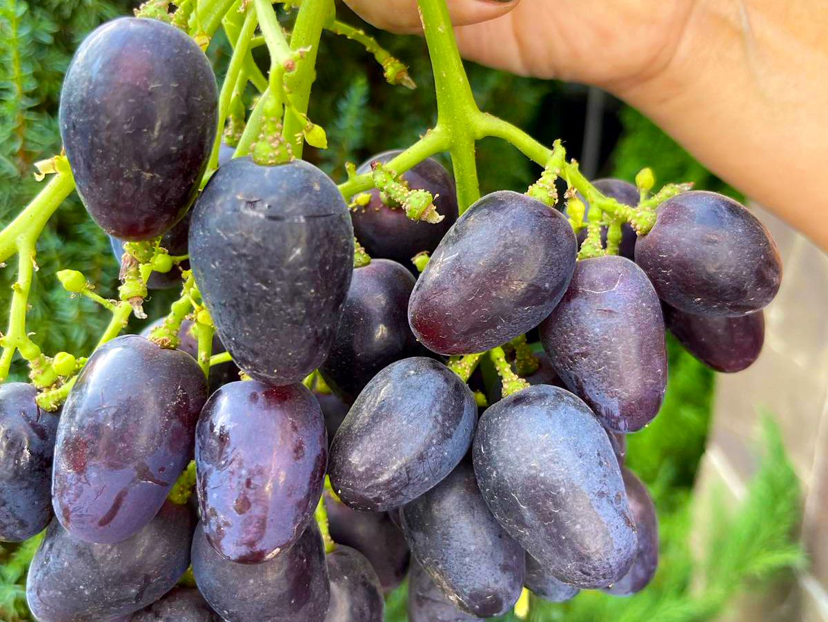 Ягоди овально-ромбовидні, у стадії повної зрілості забарвлені у фіолетово-синій колір, дуже великі (як для кишмишу), окрема виноградина сягає приблизно 34х48 мм і важать 12-16 грамів. М'якоть дуже м'ясиста, соковита і хрумка. Шкірка тонка, але міцна, не розтріскується, легко з'їдається. Смак гармонійний, де насолода переплітається з легкими фруктовими нотками, створюючи освіжаючий букет без зайвої приторності. Вміст цукру в ягодах становить 20%. Сорт відноситься до III класу безнасінності, коли ягода містить від 10,1 до 14 мг рудиментів (зачатків кісточок), які можуть бути відчутні при пережовуванні, особливо в ягодах, що перестигли. Виноград має відмінну товарність, добре зберігається на кущах до кінця вересня, не втрачаючи свіжості та привабливості.