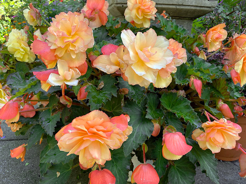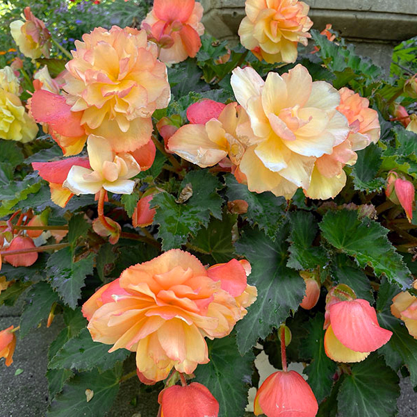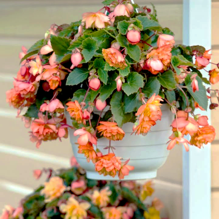 Розмір цибулини 4/5Бегонія Каскад Санрей — розкішна каскадна бегонія з повністю махровими квітами персикового кольору. По краю пелюсток є чітко окреслений вузький кант коралового відтінку дуже яскравий і ефектний сорт.