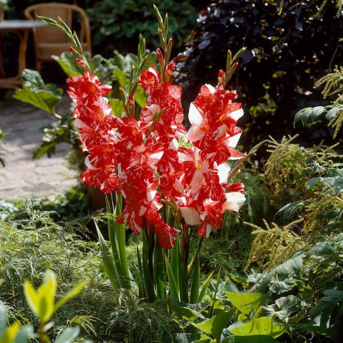 У саду: Це сорт-акцент. Його краще садити групами по 5–10 цибулин на тлі однотонних зелених чагарників або поруч із кремовими та жовтими гладіолусами, щоб підкреслити його строкатість.