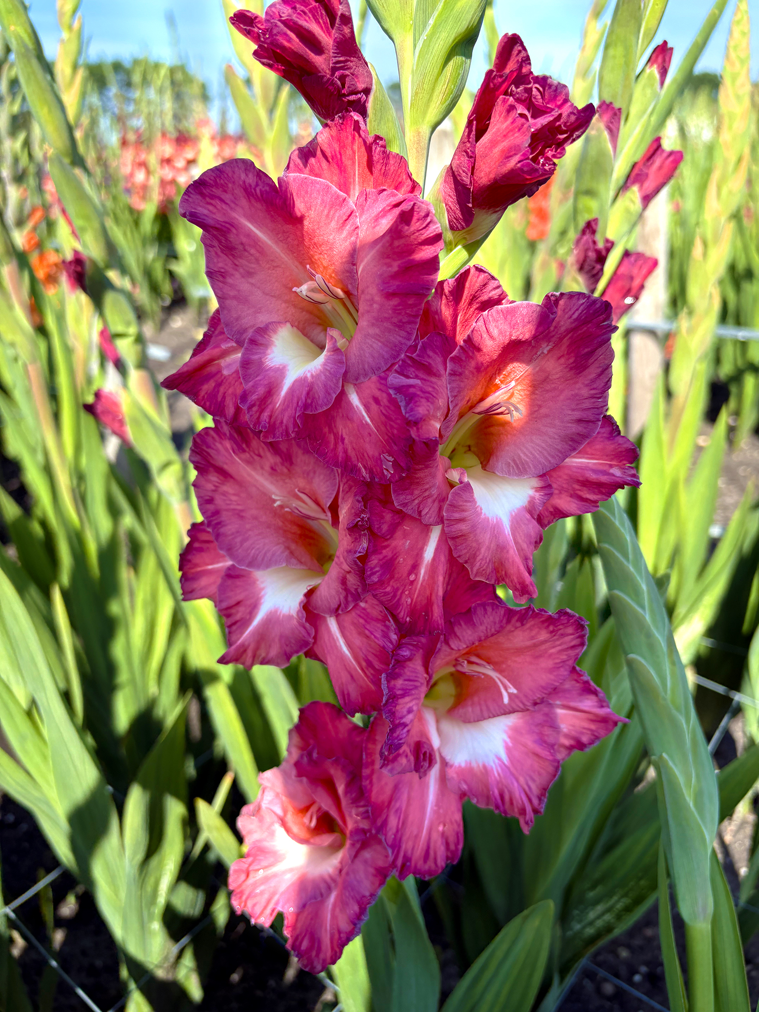 • Оформлення клумб: Гладіолуси прекрасно поєднуються з іншими квітами, такими як лілії, троянди, дельфініуми.
