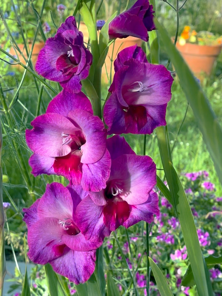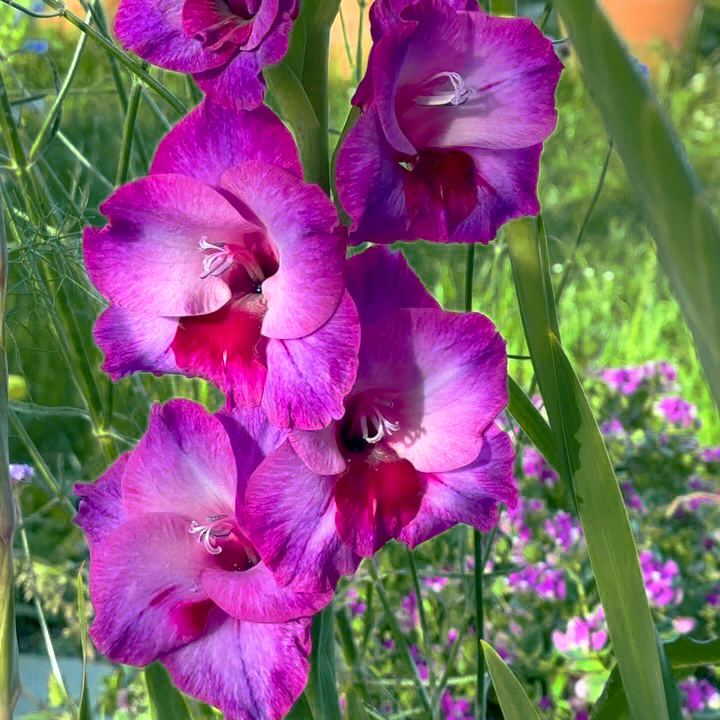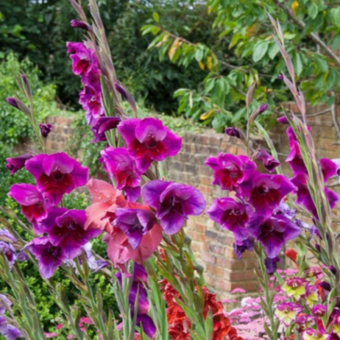 • Оформлення клумб: Гладіолуси прекрасно поєднуються з іншими квітами, такими як лілії, троянди, дельфініуми.