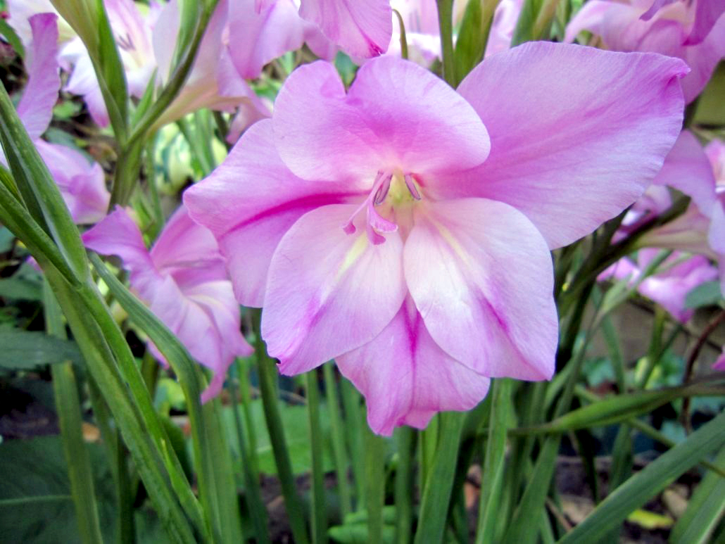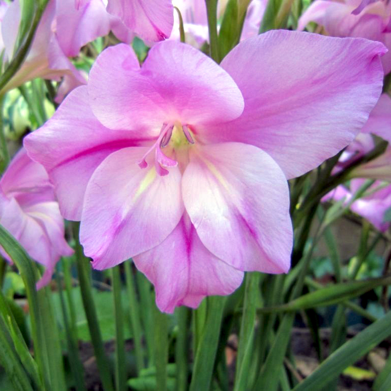 Розмір цибулини 7/8 Гладіолуси Нанус – група низькорослих (40-70 см) витончених гібридів, що цвітуть з липня до вересня. Ці багаторічники мають мечоподібне листя та ароматні квіти різних відтінків (білі, рожеві, червоні), що робить їх ідеальними для бордюрів, вазонів та на зріз. Особливо добре підходять для густих посадок на повному сонці або півтіні. Уникнення прямих сонячних променів у другій половині дня значно продовжує період цвітіння. Гладіолус Чармінг Леді рясно цвіте фіолетово-рожевими квітками з блідо-білою цяткою на нижній губі.