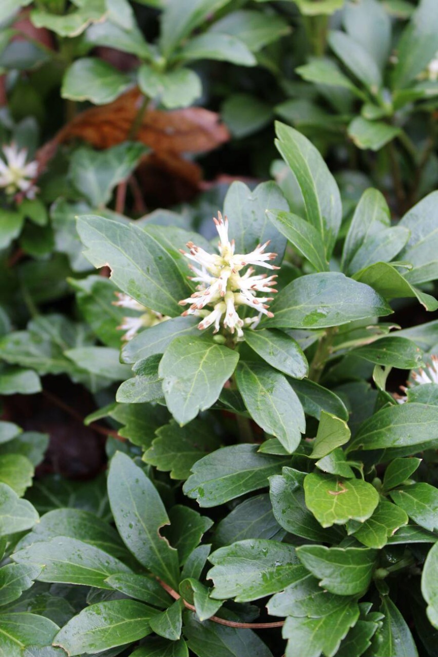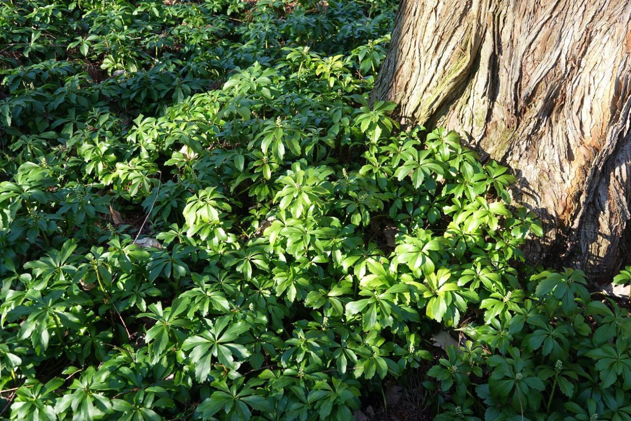 Пахизандра верхушечная — стелющийся полукустарник, принадлежащий к семейству Самшитовых. Представляет собой очень ценное вечнозеленое, почвопокровное, карликовое растение с недревеснеющими побегами. Образует плотные ковры ярко-зеленого цвета, состоящие из прямостоячих стеблей, достигает в высоту 15-20 см. Корневая система поверхностная, мясистая, волокнистая, образующая корневые отпрыски. Чувствительна к уплотнению почвы. Растение медленно растущее. Все, что необходимо для правильного роста пахизандры – это сухое, тенистое место. Листья у пахизандры зимующие, овальной или яйцевидной формы, блестящие, темно-зеленого цвета с неровными краями, собраны в розетки на концах побегов. Каждий листочек живет 3 года, чем и обеспечивается плотность покрова. Каждый ярус листьев – это годичный побег. Весной, в период апрель – май, пахизандра цветет зеленовато-белыми цветочками, которые собраны в малозаметные, кистевидные соцветия на верхней части побегов. Правда, особой декоративной ценности они не представляют.