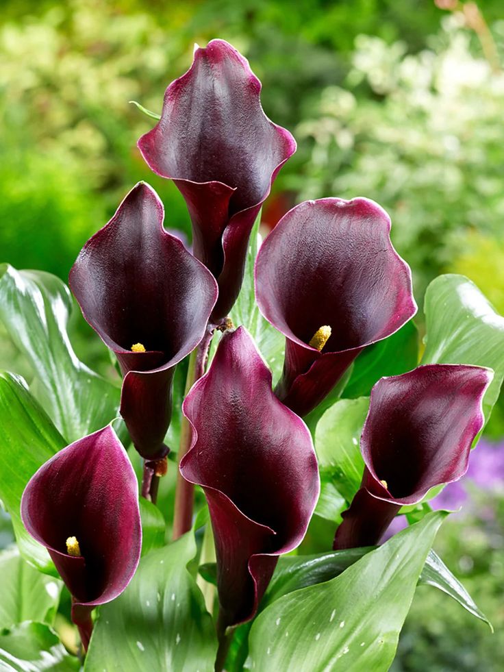 Особенность: В отличие от многих других калл, листья Captain Caruso обычно или с минимальным количеством пятнышек. Это подчеркивает благородство сорта — сплошная зелень создает идеальный контраст с темными цветами.