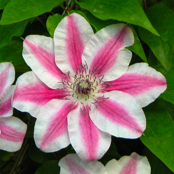 Клематис 'Souvenir du Capitaine Thuilleaux' — это проверенный временем классический сорт, который ценят чрезвычайно большие, двухцветные цветы и элегантный вид. Он принадлежит к группе раннецветущих крупноцветных клематисов.