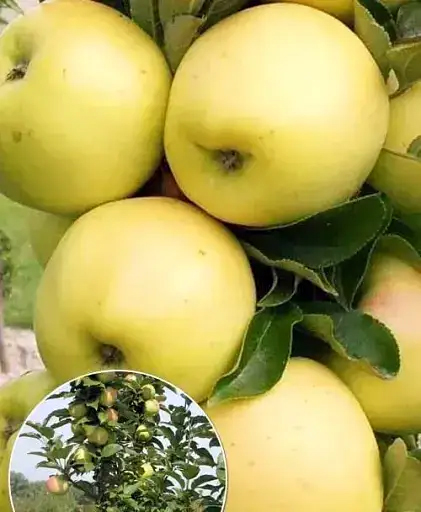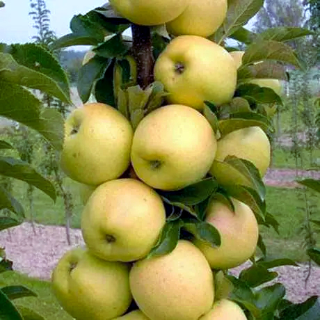 Яблоня колоновидная Белладонна — это полукарликовое, практически карликовое дерево. Высота красавицы «,Белладонны», достигает 2,5 м. Крона дерева покрыта зеленой листвой, сохраняющей свой окрас до глубокой осени. Плоды округлые, покрытые золотисто-желтой кожурой с красным румянцем на солнеченой стороне. Кожура у яблок плотная, тонкая и глянцевая. Белоснежна мякоть яблок сорта Белладонна сладкая, сочная, с небольшой кислинкой. По структуре мелкозернистая, хрустящая и откалывающаяся при надкусывании или разрезании. По весу плоды могут достигать 140-250 г. Сорт яблони Белладонна, устойчив к парше и основным видам заболеваний. Благодаря этому яблоки имеют товарный вид и не нуждаются в обработке.