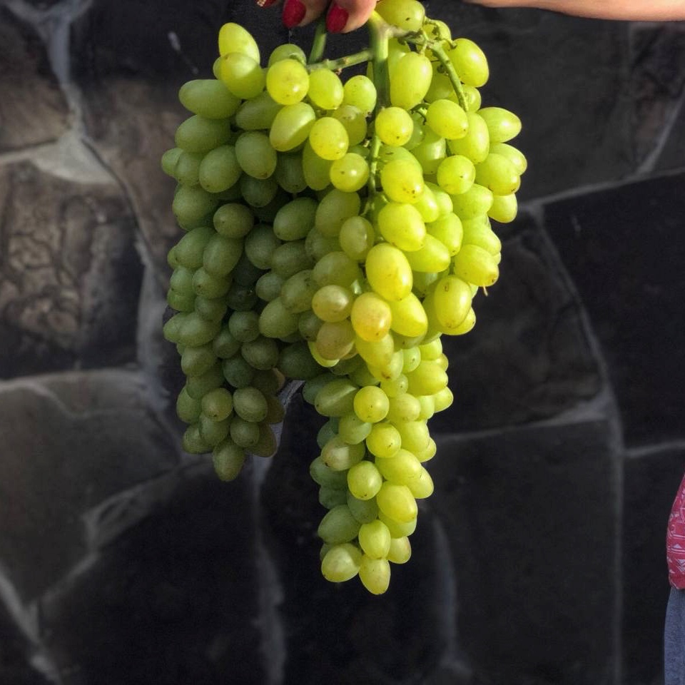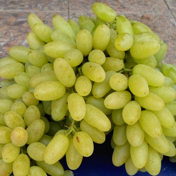 Ягода: Крупная, овальная или удлиненная, весом 7-9 г. Цвет кожицы светло-желтый или янтарный. Мякоть плотная, хрустящая, сочная, с приятным мускатным ароматом и гармоничным вкусом. Кожица тонкая, при еде не ощущается. Класс бессемянности I (без семян или с очень мягкими, неощутимыми рудиментами).