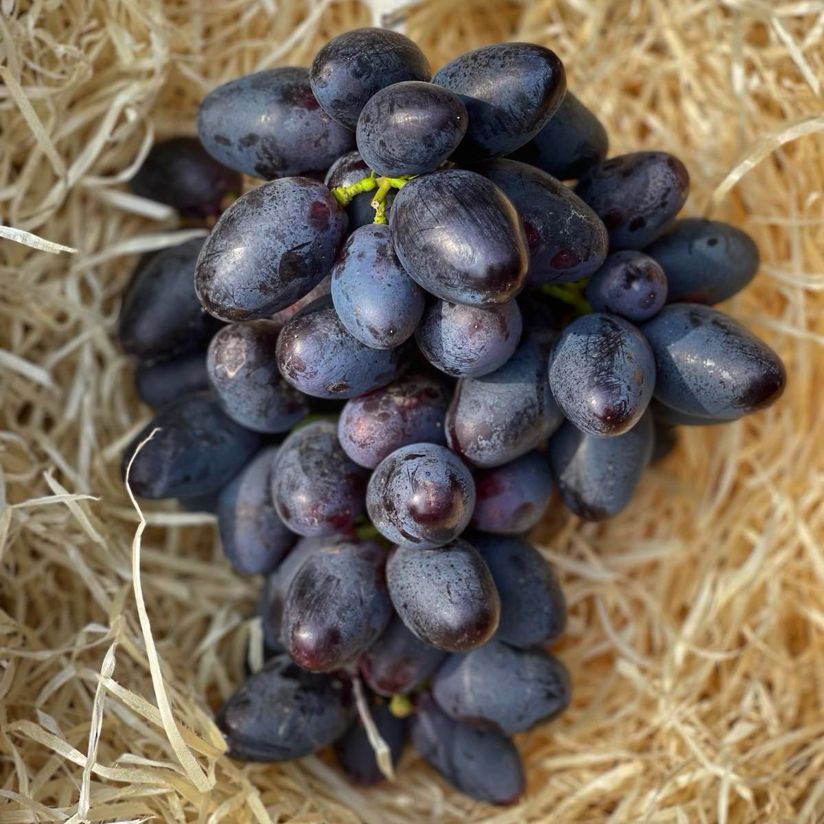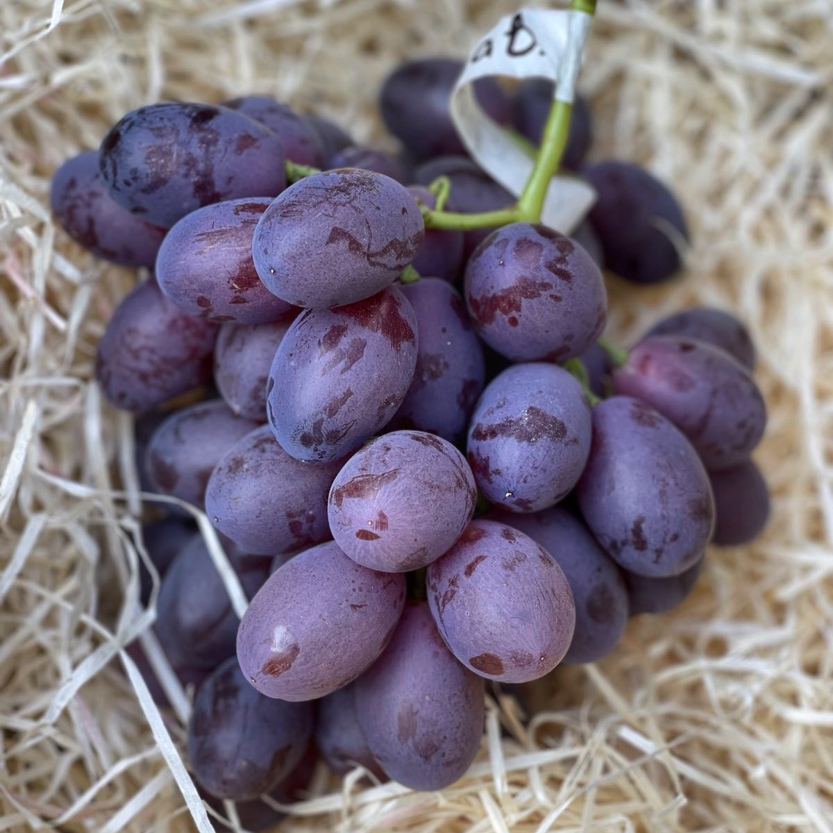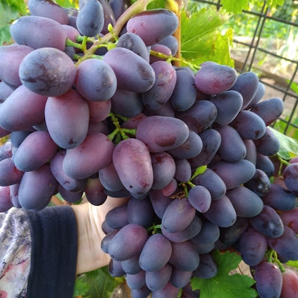 Ягода: Очень крупная, вытянутая, овально-пальчиковая, весом 15-20 г. Цвет кожицы варьируется от темно-розового до темно-фиолетового, почти черного. Мякоть плотная, мясистая, с гармоничным, приятным вкусом. Кожица тонкая, при еде не ощущается.