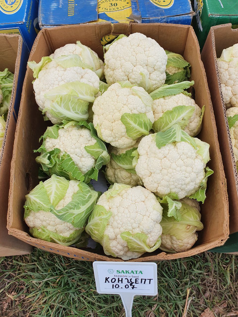 Головки массой 1,2-2,5 кг, белоснежно-белого цвета, куполообразной формы, хорошо защищены плотными покровными листьями (в несколько слоев).