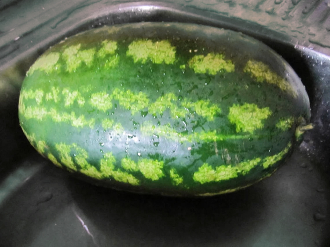 Плоды удлиненно-овальные, типа Crimson Sweet, выровненные, достигают в весе 8-11 кг, при нормировании нагрузки (1-2 плода на растение) легко вырастают до 12-15 кг. Кора средней толщины (9–12 мм), темно-зеленая с четкими широкими светло-зелеными полосами. Мякоть ярко-красного цвета, плотная, хрустящая, очень сладкая (сахаристость 11-13 %), практически без прожилок и пустот. Семена мелкие, темно-коричневые, немногочисленные. Транспортабельность и лежкость отмечаются отличные: при +10…+15°C плоды хранится до 4-5 недель после сбора без потери вкуса и тургора. Товарный вид плодов также отмечается высокий: кора прочная, не трескается при перевозке и перезревании на корню, поверхность глянцевая. Плоды хорошо переносят механизированную уборку и дальнюю транспортировку. Урожайность в открытом грунте составляет 35-50 т/га, в зависимости от региона и агротехники, при капельном поливе и нормировании – до 60-70 т/га.