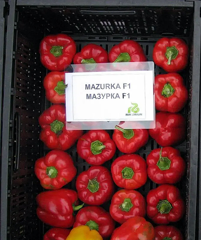 Перец сладкий Мазурка F1 — высокоурожайный гибридный сорт среднеспелого срока созревания с удлиненным периодом сбора плодов. Продукт стараний голландских селекционеров. Вегетационный период составляет 70-80 дней от высаживания рассады на постоянное место. Рекомендован для выращивания в пленочных теплицах, невысоких тоннелях и в открытом грунте. Формирует среднерослое растение, имеющее обильные листья, с короткими междоузлиями и мощной корневой системой. Хорошо реагирует на умеренный капельный полив, внесение комплексных удобрений. Плоды блочного типа, внутри насчитывают 4 камеры, в стадии биологической спелости окрашены в насыщенный красный цвет, вырастают в размере 9-10х6-8 см и весят 200-250 граммов (до 350 г), толщина стенки составляет 8-9 мм. Гибрид характеризуется высокими вкусовыми качествами. Плоды содержат большое количество сухих веществ из-за этого идеальны для переработки. Возможна реализация товарных плодов как в фазе технической, так и биологической зрелости. Отмечается высокий выход стандартной продукции в течение всего сезона выращивания. Гибрид не подвержен бактериальной пятнистости (расы 1-3), Y-вирусу картофеля (штамм 0), тобамовирусу (патотип P0). Также отмечается хороший уровень устойчивости к неблагоприятным факторам и стрессовым условиям взращивания. Рекомендованная плотность посадки должна составлять 3 растения на 1 м2 (для закрытого грунта) и 30-35 тыс. растений на 1 га (для открытого грунта).