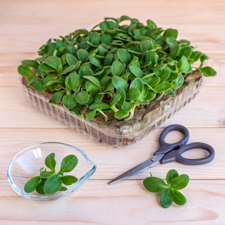 Через 7-14 дней (когда появится первая пара настоящих листочков, высота 5-9 см) срежьте микрозелень острыми ножницами или ножом чуть выше поверхности субстрата. Не переращивайте – вкус становится менее нежным.