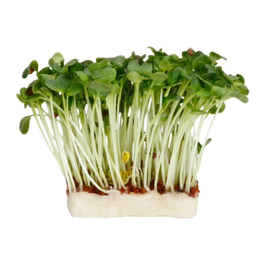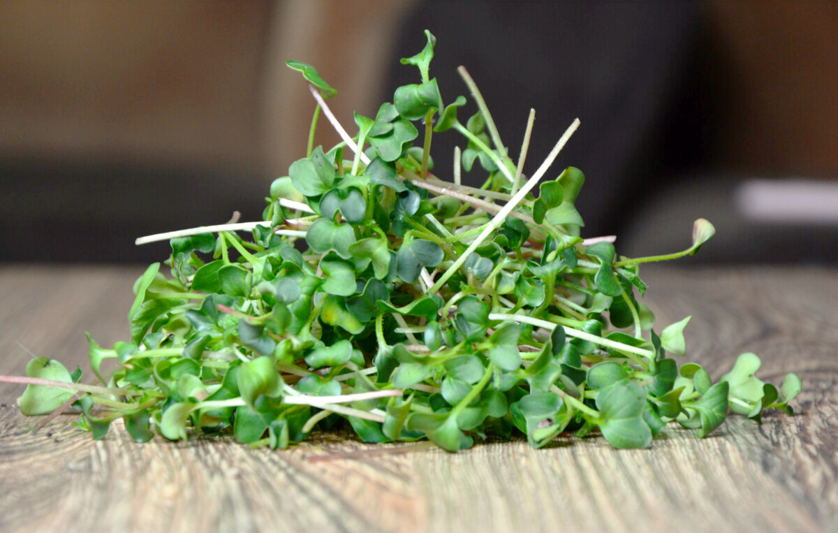 Микрозелень – это молодые растения в фазе первой пары настоящих листочков (срезают стебель с первыми листьями над поверхностью почвы или субстрата через 7-14 дней). Выращивают в почве, на ковриках или гидропонике. Имеет насыщенный, выраженный вкус, напоминающий взрослое растение (например, шпинат, редис, подсолнечник, брокколи).