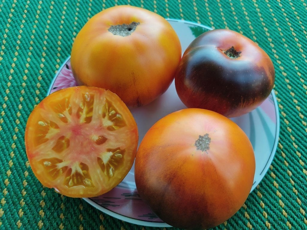 Томат Бузо (Buzau) — красивый, суперсладкий сорт среднераннего срока созревания с отличной урожайностью. Яркая новинка 2020 года из Франции. Растение индетерминантного типа, прочные, среднеоблиственные, достигает в высоту 1,4-1,6 м, требует подвязки к опоре и пасынкования. Наилучшие результаты получились при формировании растения в 2 стебля. Кисти были в основном по 3-5 завязей. Плоды необыкновенно красивые, плоско-округлой формы, с пышными «плечиками», достигают в весе 140-300 г, в стадии биологической спелости окрашены в оранжевый цвет с антоциановыми (темно-фиолетовый или почти черный цвет) штрихами и разводами на боках и такими же плечиками. В разрезе многокамерные, оранжевого цвета, часто в перемешку с розовым. Мякоть ароматная, вкус отличный, приятный, довольно сладкий, с нотками экзотики. При условии соблюдения агротехники, урожайность сорта составляет свыше 5 кг плодов с 1 растения.
