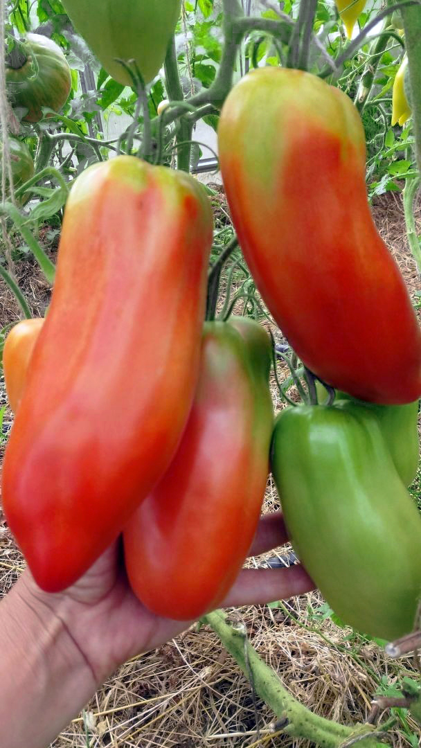 Плоды удлиненной перцевидной формы с острым носиком, часто слегка загнутые (форма "зуб дракона"), внутри внутри насчитывют несколько семенных камер, среднеразмерные, достигают до 15 см в длину и весят 80-120 г (до 200-300 г в теплице при нормировке). В стадии биологической зрелости окрашены в ярко-красный цвет. Мякоть плотная, мясистая, зернистая, не водянистая, сочная, без полостей, почти без семян. с отличным помидорным вкусом — сладким и насыщенным. Сорт относительно устойчив к основным заболеваниям томатов. Томаты не склонны к растрескиванию. Плоды хорошо транспортируются и хранятся. Сорт обладает высоким потенциалом урожайности – до 8-10 кг с растения. Предназначены для реализации на рынке свежей продукции, потребления в свежем виде, цельноплодного консервирования и засолки (идеален для бочек и банок благодаря плотной мякоти).