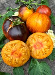 Внешне: Основной фон — золотисто-оранжевый, украшен яркими красными и розовыми продольными полосами. Плечики томата (верхняя часть) покрыты густым темно-фиолетовым (почти черным) антоцианом, который становится интенсивнее на солнце.