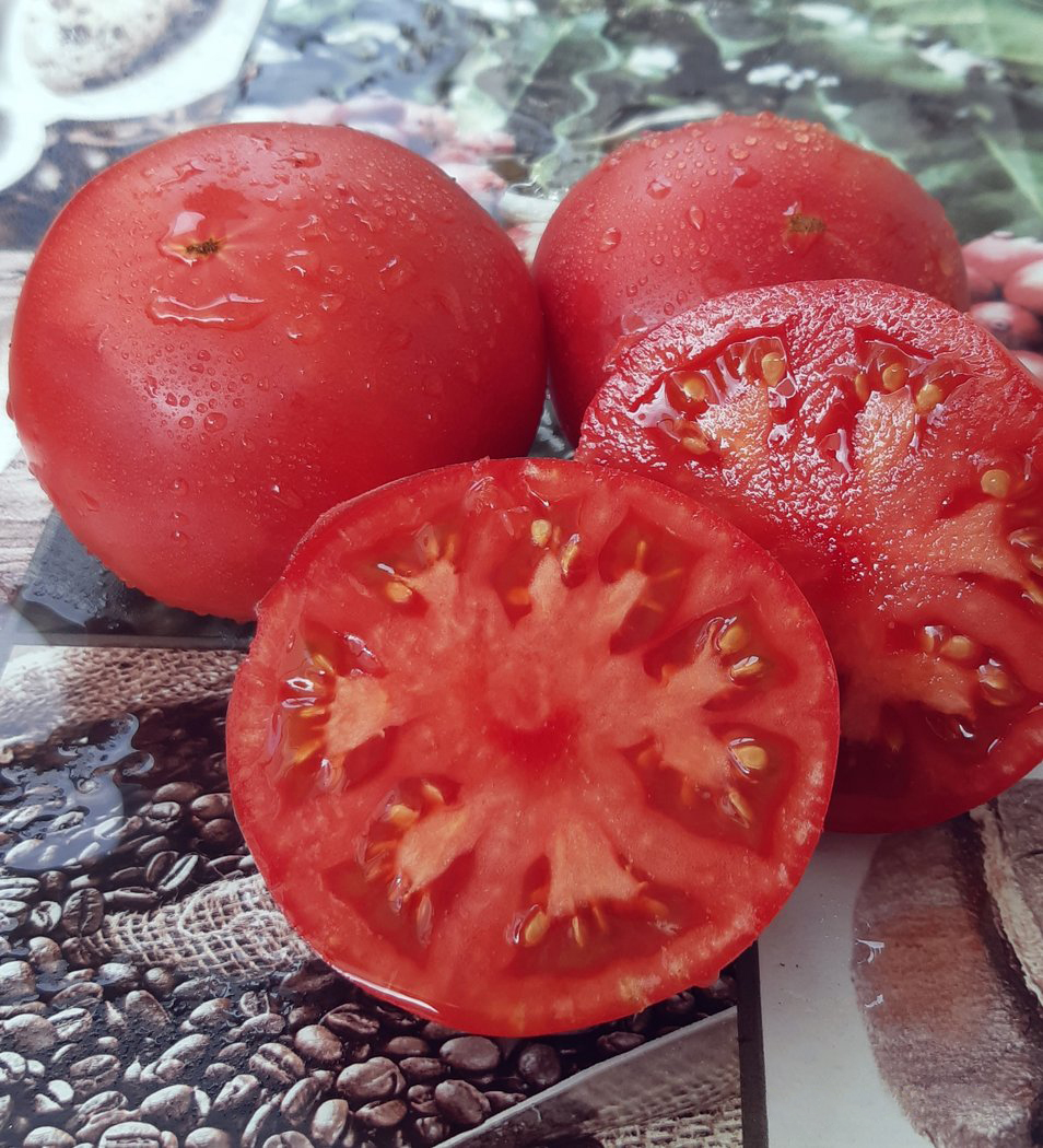 Плоды крупные, округлой или плоско-округлой формы, с незначительной ребристостью у плодоножки, не склонные к растрескиванию, без зеленого пятна у плодоножки, средний вес составляет 200-400 г (до 500-600 г при нормировке завязей). В стадии биологической зрелости окрашены в насыщенный розовый цвет. Мякоть мясистая, сахаристая на изломе, многокамерная, очень сочная, с высоким содержанием каротина и отличным сбалансированным вкусом — сладким с легкой фруктовой кислинкой и приятным ароматом. Сорт обладает высоким потенциалом урожайности — до 6-8 кг с растения. Плоды хорошо транспортируются и хранятся. Предназначены для реализации на рынке свежей продукции, потребления в свежем виде (салаты, нарезка), приготовления соков и соусов.