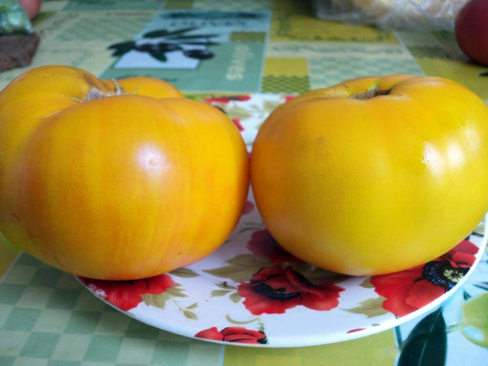 Плоды крупные, округлой или плоско-округлой формы с незначительной ребристостью у плодоножки, не склонные к растрескиванию, без зеленого пятна у плодоножки, средний вес составляет 200-400 г (до 500-600 г при нормировке завязей). В стадии биологической зрелости окрашены в яркий желтый или золотисто-желтый цвет. Мякоть мясистая, сахаристая на изломе, многокамерная, очень сочная, с высоким содержанием каротина и отличным сбалансированным вкусом — сладким с легкой фруктовой кислинкой и приятным ароматом. Сорт обладает высоким потенциалом урожайности — до 6-8 кг с растения. Плоды хорошо транспортируются и хранятся. Предназначены для реализации на рынке свежей продукции, потребления в свежем виде (салаты, нарезка), приготовления соков и соусов.