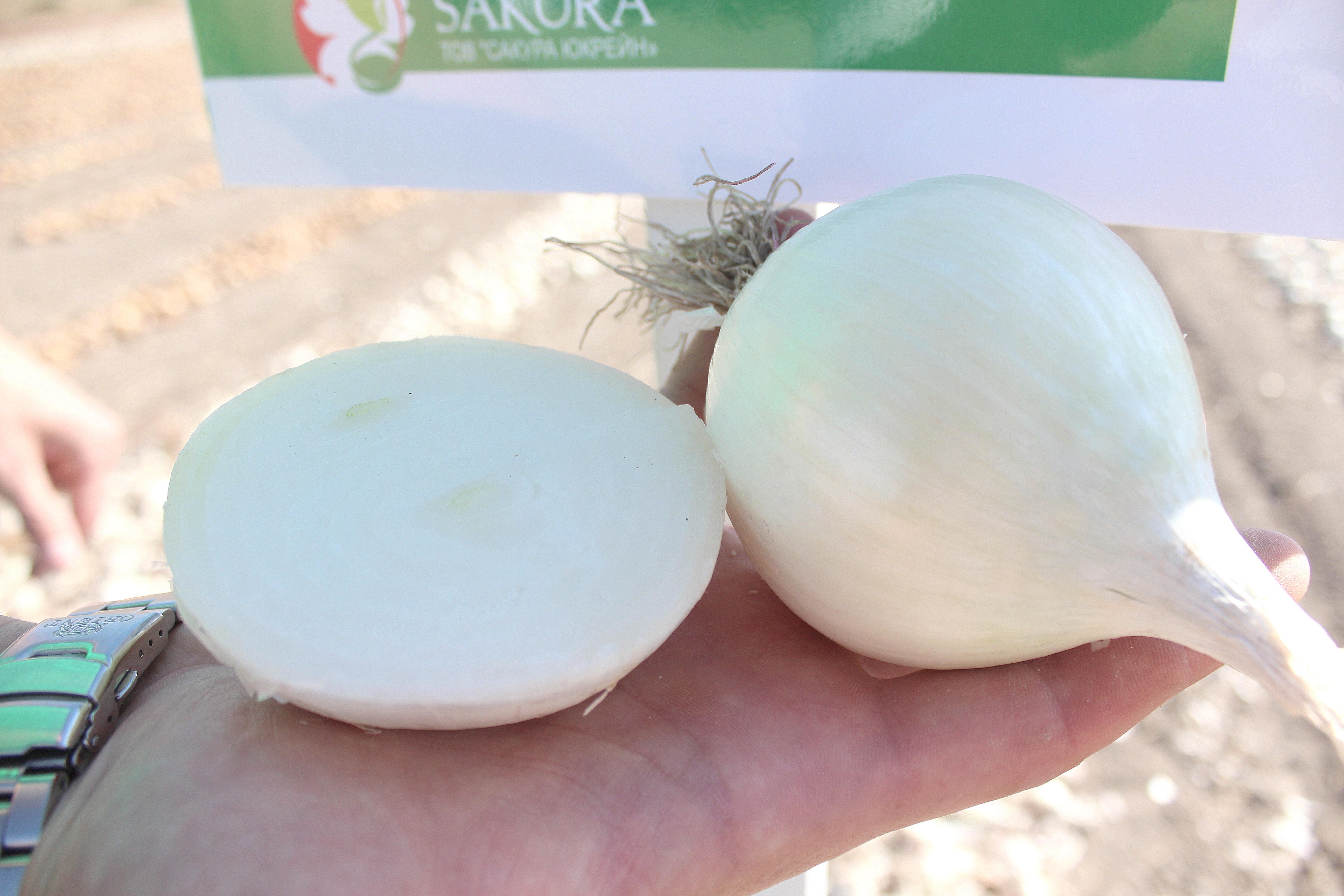 формирует однородные луковицы, округлой формы, белого цвета. Диаметром 8-9 см. Отлично покрыты чешуйками.