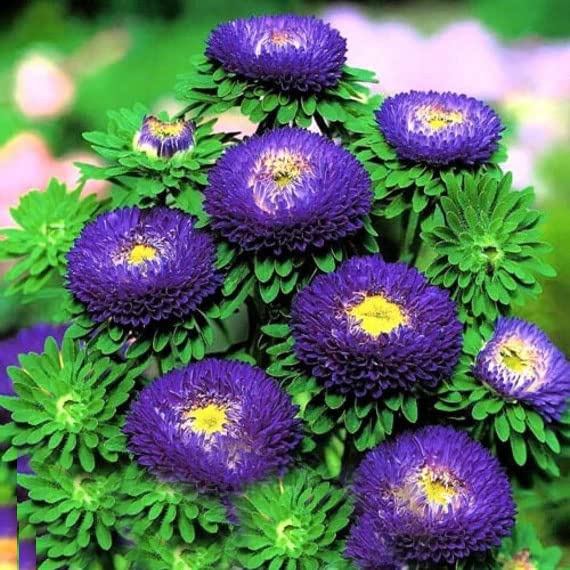 Астра помпонная Темно-Голубая — вся элегантность и красота пионов и садовых хризантем в едином, легко выращиваемом, однолетнике. Образует мощный высокорослый куст колоновидной формы с прямостоячими, гибкими стеблями, 65-70 сантиметров в высоту. Астра обильно кустится, каждое растение насчитывает 8-10, а иногда и до 30-ти, прочних цветоносов. Листья овальные, на конце заостренные, зубчатые. Цветение астры начинается с середины июля. В этот период на кончиках цветоносов, с превосходной однородностью, раскриваются махровые соцветия полусферической формы, 8-10 сантиметров в диаметре. Пушистые корзинки на самом деле не цветки, а соцветия, состоящие из ложноязычковых ладьевидной формы и трубчатых цветков. Цветки астры – это то, что большинство далеких от ботаники людей считает ее лепестками. Астры находят универсальное применение – от выращивания на срез до оформления клумб и цветников. Астра светолюбива и холодостойка, выносит понижение температуры до -3°C. Хорошо переносит пересадку в цветущем виде. В сухую жаркую погоду растения обильно поливают. Предпочитает солнечное место посадки и нейтральную почву. Требуется редкий, но обильный полив и осторожное рыхление.