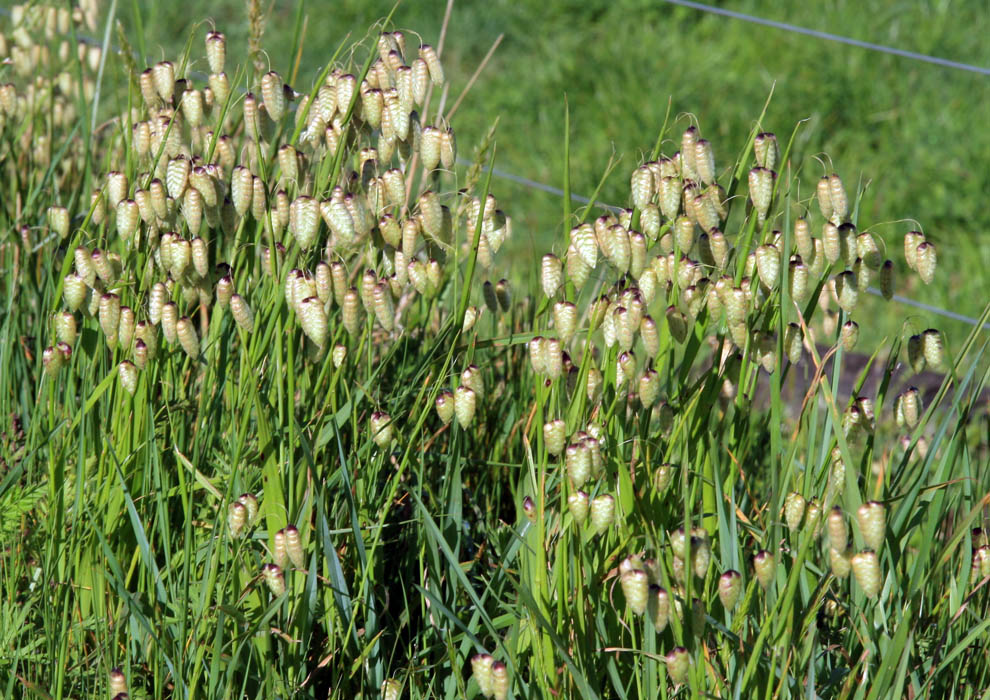 Особенность: Колоски легко колеблются от малейшего дыхания ветра, создавая эффект "дрожания" или "тряски", что и дало растению его народное название. Украинские народные названия: "кукушкины слезы" и "слезы Богородицы".