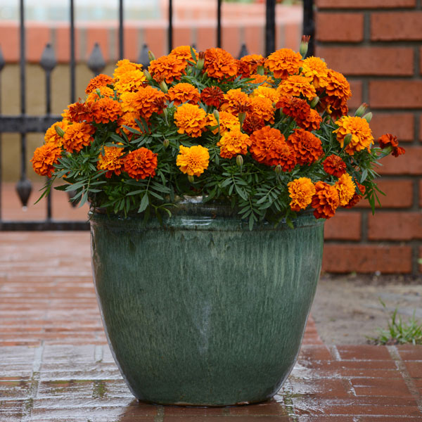 Бархатци смесь низкорослых – растения с прекрасными махровыми и полумахровыми соцветиями, красиво смотрятся в вазонах, горшках, используются в ковровых посадках и клумбах. Цветут обильно и продолжительно – кусты с июля по октябрь покрыты яркими соцветиями. Предпочитают солнечные участки.