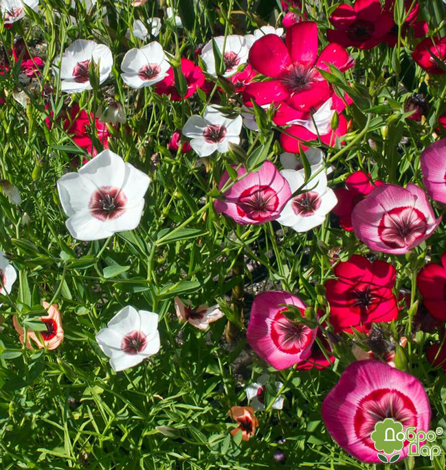 Лен крупноцветковый представляет собой однолетнее травянистое растение, естественным ареалом обитания которого является северо-западный регион Африки, кроме того, в дикорастущем виде он широко представлен на территории Северной Америки и юге Европы. Кустик раскидистый, выростает в высоту до 50 сантиметров. Стебель сугубо прямостоячий и ветвистый, достаточно хорошо покрыт сидячими очередными листьями с типичным заострением на конце. Цветки мелкие, достигают в диаметре до 3 сантиметров, окрашены в карминово-красный, белый с красными глазками и в голубой цвета, собраны в зонтиковидные рыхлые соцветия, закрыты в пасмурную погоду и полностью открываются в солнечную погоду. Период цветения начинается ранней весной и длится до первой половины октября. После этого на растении появляется плод-коробочка диаметром около 5 милиметров, в котором дозревает большое количество сплюснутых по форме коричневых семян. Чтобы продлить период цветения, нужно периодически срезать недозревшие коробочки, что стимулирует растение к новому цветению. Лен крупноцветковый предпочитает открытые солнечные участки с легкими и плодородными почвами. Вид культивируется исключительно в декоративных целях, поскольку его хозяйственная ценность сведена к минимуму. Подходит для рабаток, альпийских горок и для выращивания на срез.