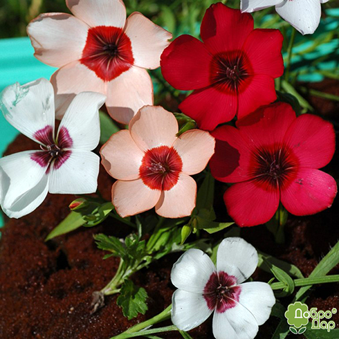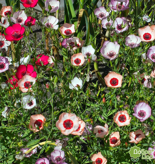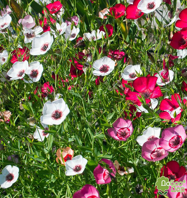 Лен крупноцветковый представляет собой однолетнее травянистое растение, естественным ареалом обитания которого является северо-западный регион Африки, кроме того, в дикорастущем виде он широко представлен на территории Северной Америки и юге Европы. Кустик раскидистый, выростает в высоту до 50 сантиметров. Стебель сугубо прямостоячий и ветвистый, достаточно хорошо покрыт сидячими очередными листьями с типичным заострением на конце. Цветки мелкие, достигают в диаметре до 3 сантиметров, окрашены в карминово-красный, белый с красными глазками и в голубой цвета, собраны в зонтиковидные рыхлые соцветия, закрыты в пасмурную погоду и полностью открываются в солнечную погоду. Период цветения начинается ранней весной и длится до первой половины октября. После этого на растении появляется плод-коробочка диаметром около 5 милиметров, в котором дозревает большое количество сплюснутых по форме коричневых семян. Чтобы продлить период цветения, нужно периодически срезать недозревшие коробочки, что стимулирует растение к новому цветению. Лен крупноцветковый предпочитает открытые солнечные участки с легкими и плодородными почвами. Вид культивируется исключительно в декоративных целях, поскольку его хозяйственная ценность сведена к минимуму. Подходит для рабаток, альпийских горок и для выращивания на срез.